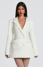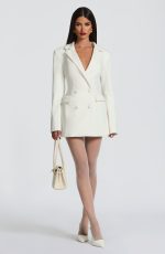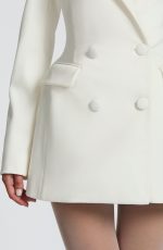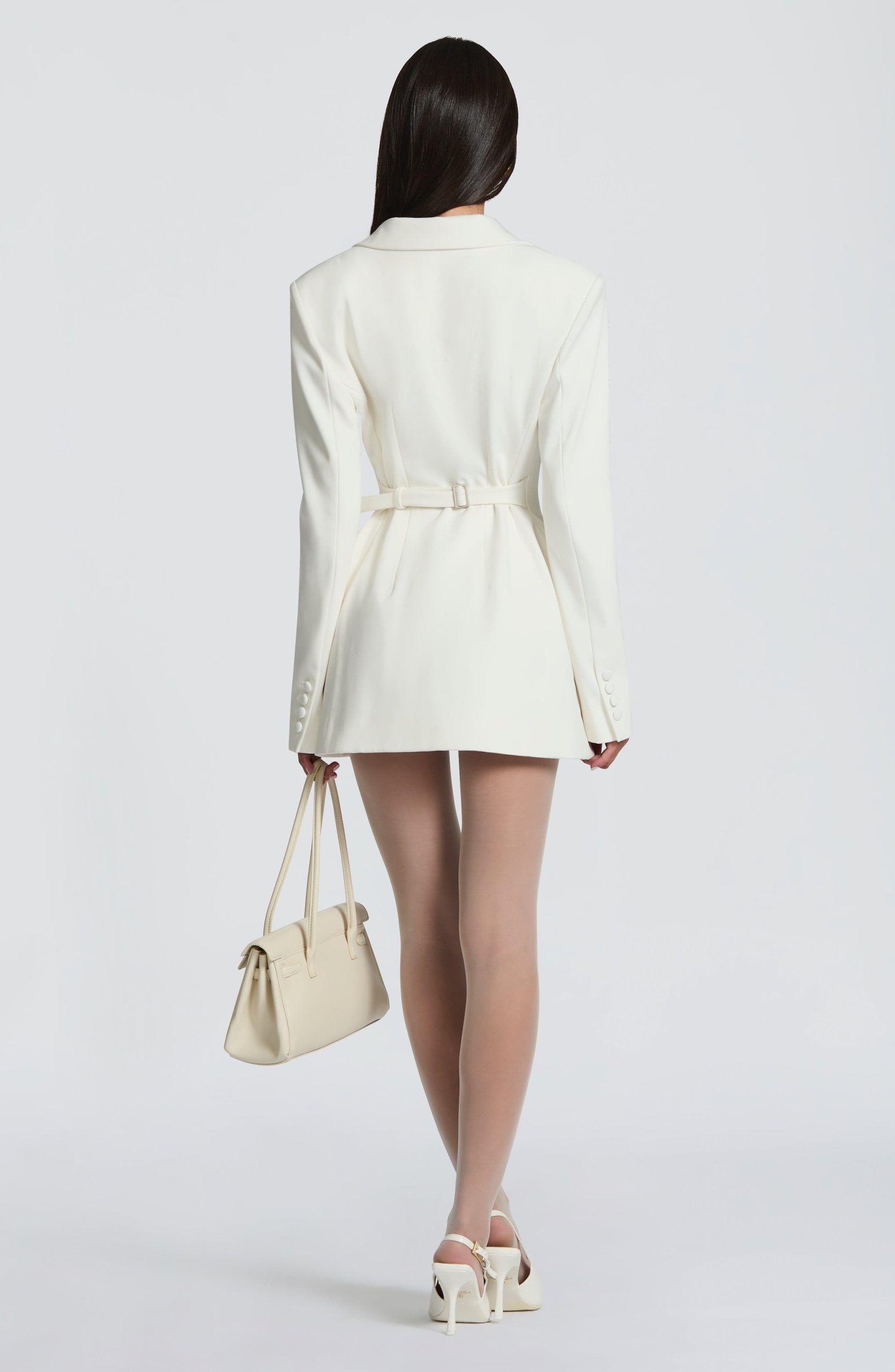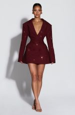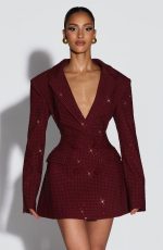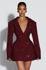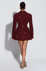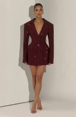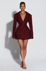 Elevate your evening with the Elvira Mini Dress in plum brown. This tailored silhouette features a double-breasted cut, cinched waist, and structured shoulder pads for a polished, editorial look. Round hotfix rhinestones catch the light across the non-stretch woven suiting, while the notched lapel collar adds refined detail.