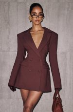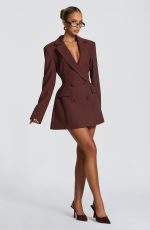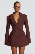 The Elvira Mini Dress in Plum Brown features a refined double-breasted design with a tailored, cinched waist that enhances your silhouette. Crafted from non-stretch woven suiting fabric, complemented by shoulder pads and a classic notched lapel collar.