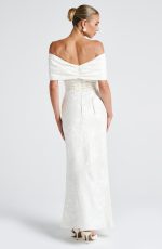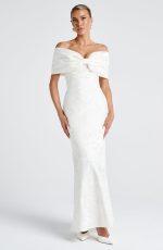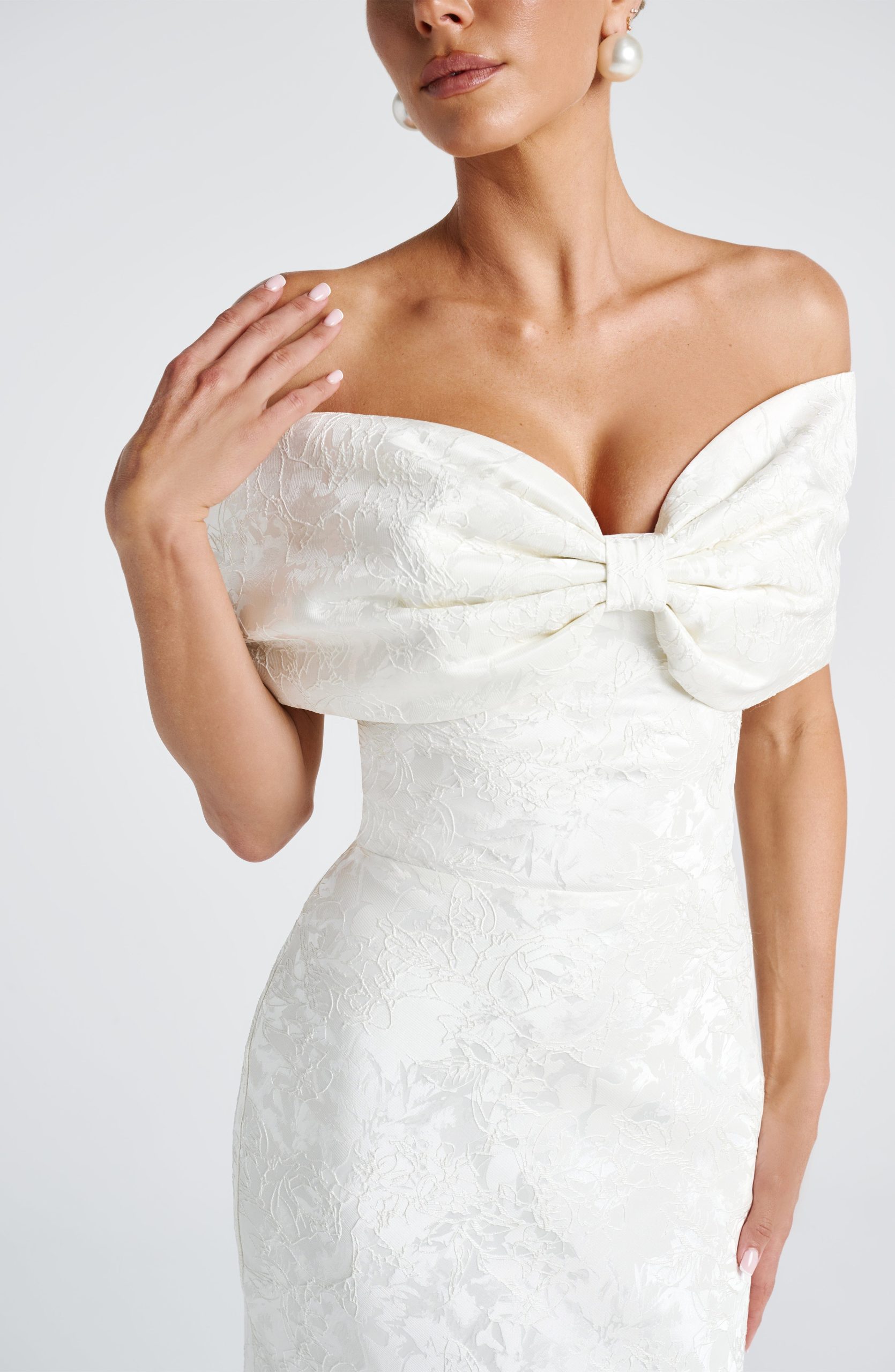 Ethereal elegance meets modern romance in the Emberly Maxi Dress. Designed to flatter from every angle, this bias-cut beauty effortlessly skims your curves, while the lace-up back ensures a flawless, custom fit. The off-the-shoulder bardot bow neckline highlights your décolletage with timeless allure, adding a touch of feminine charm. Crafted from luxurious floral jacquard fabric, this gown is the epitome of sophistication – perfect for making an unforgettable entrance.
