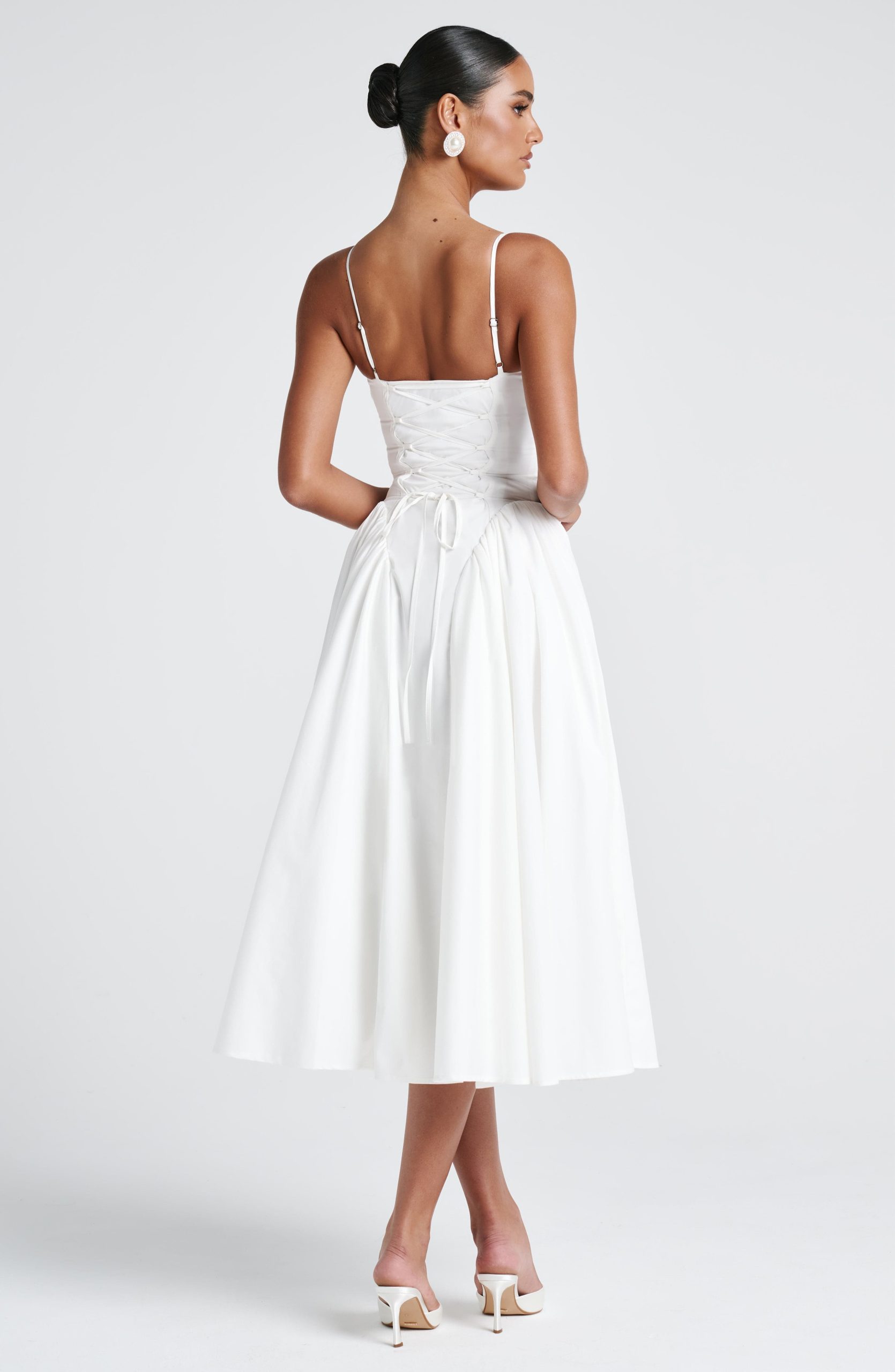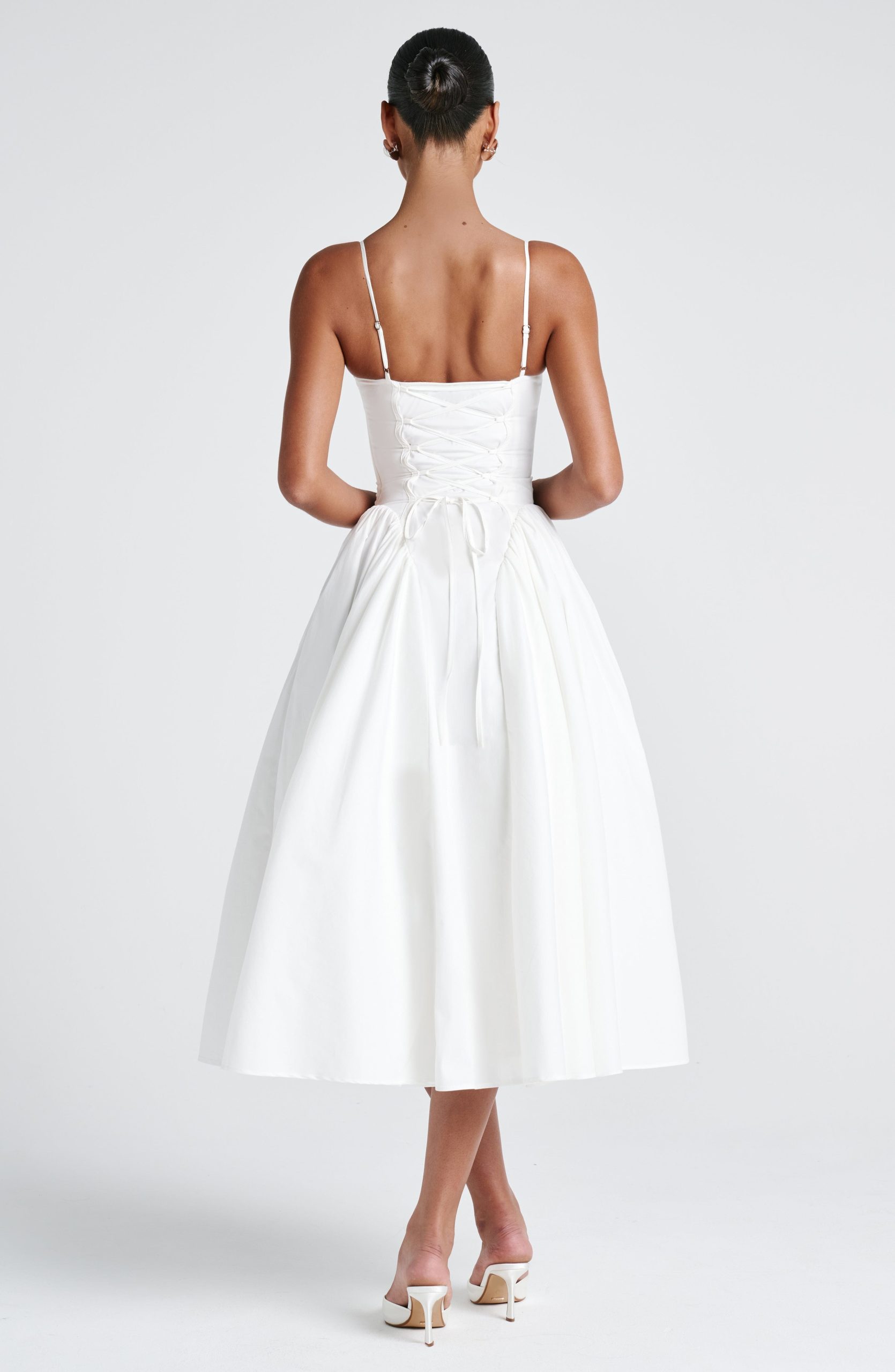 The Emerson Midi Dress in Clay is a beautifully crafted, design that combines classic elegance with a modern twist. Featuring a flattering sweetheart neckline, this dress is designed with a lace-up back for a customisable, snatched fit. The dropped waist enhances its relaxed, yet structured silhouette, while gathered godet panels on the hips create soft movement and shape. Tulle is attached to the lining to add volume and dimension to the skirt, giving it a dreamy, voluminous effect.