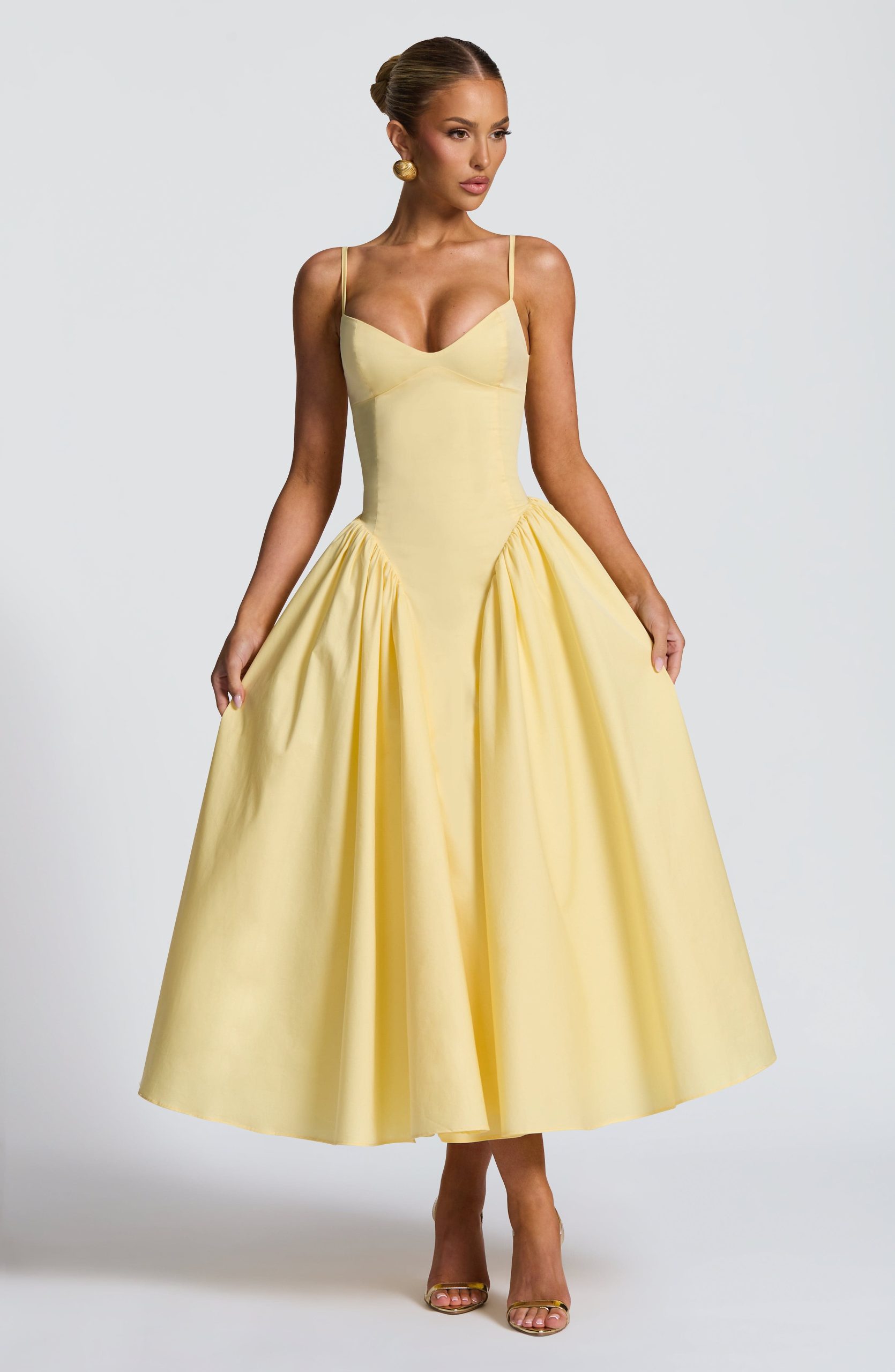 This Emerson Midi Dress in lemon features a fitted bodice with a sweetheart neckline and lace-up back for an elegant silhouette. Crafted from a cotton, nylon, and elastane blend, it offers comfort and structure. The dropped waist and godet panels add subtle volume, enhanced by tulle underlining. Fully lined with an invisible side zipper and hook & eye closure, it combines sophistication with refined detailing.
