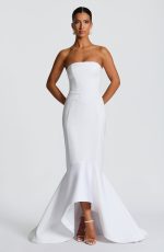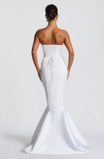 The Emryn Gown in Blush exudes timeless elegance with its meticulously structured non-stretch twill satin. The sophisticated strapless neckline frames your décolletage beautifully, while contour seams accentuate your silhouette with precision. The dramatic mermaid skirt creates a captivating silhouette that commands attention at any formal occasion.