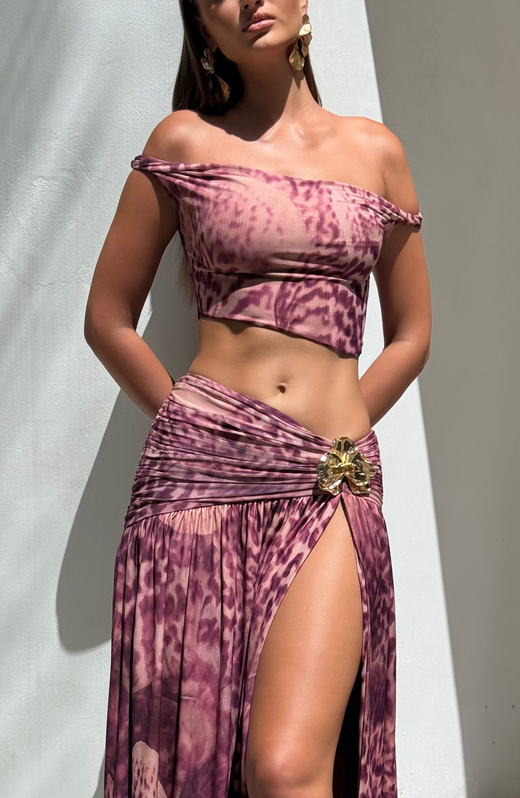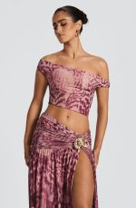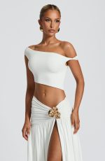 Elevate your style with the Eva Crop Top in pristine white. Crafted from soft printed mesh, this sophisticated piece features an asymmetric bardot neckline with elegant twist detail on the arm. The cropped silhouette and asymmetric hem create a refined yet contemporary look. Style with the Saira maxi skirt.