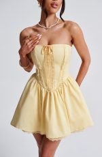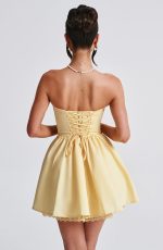 Fall in love with the Evie dress, a flirty mini with a super full skirt made with tulle for extra volume. This strapless style has a boned bodice for an extra snatched look, complete with ribbon to the bust and lace up back. Dress her up with effortless waves, pointed heels and metallic jewellery.