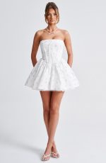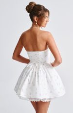 Fall in love with the Evie dress, a flirty mini with a super full skirt made with tulle for extra volume. This strapless style has a boned bodice for an extra snatched look, complete with ribbon to the bust and lace up back. Dress her up with effortless waves, pointed heels and metallic jewellery.