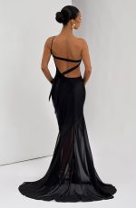 The Fable Gown in black features textured satin and a contrasting semi-sheer chiffon skirt. Its bias-cut, asymmetric one-shoulder design beautifully frames an open back with cross straps tied at the hip. The fishtail flared skirt with train adds an elegant, dramatic finish.