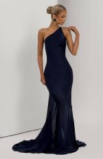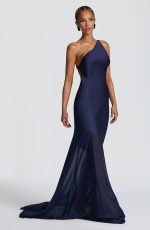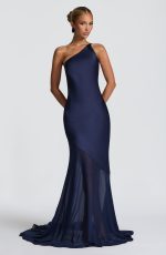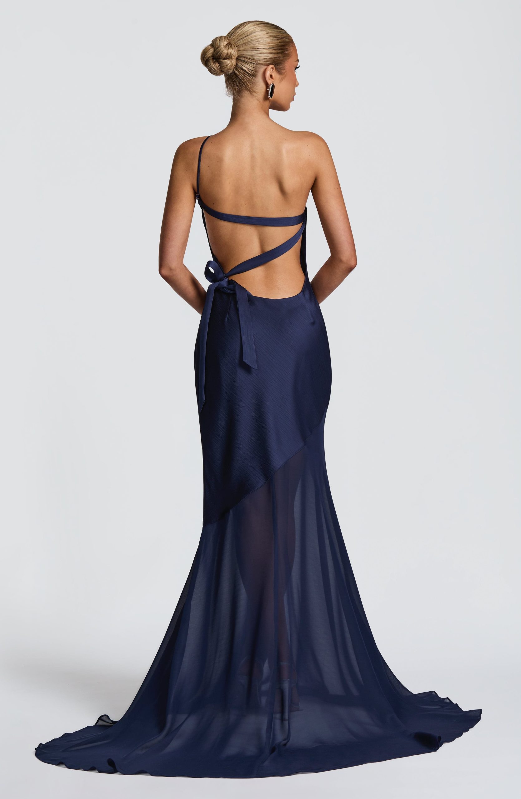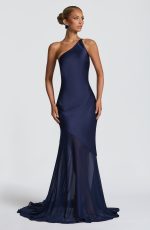 Elevate your evening with the Fable Gown in navy. Crafted from textured satin with a contrast semi-sheer chiffon skirt, it features a bias cut and an asymmetric one-shoulder neckline. The open back with cross straps and side tie enhances its elegance, while the fishtail flared skirt with train adds graceful movement.