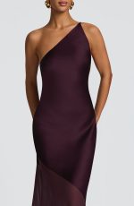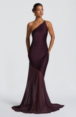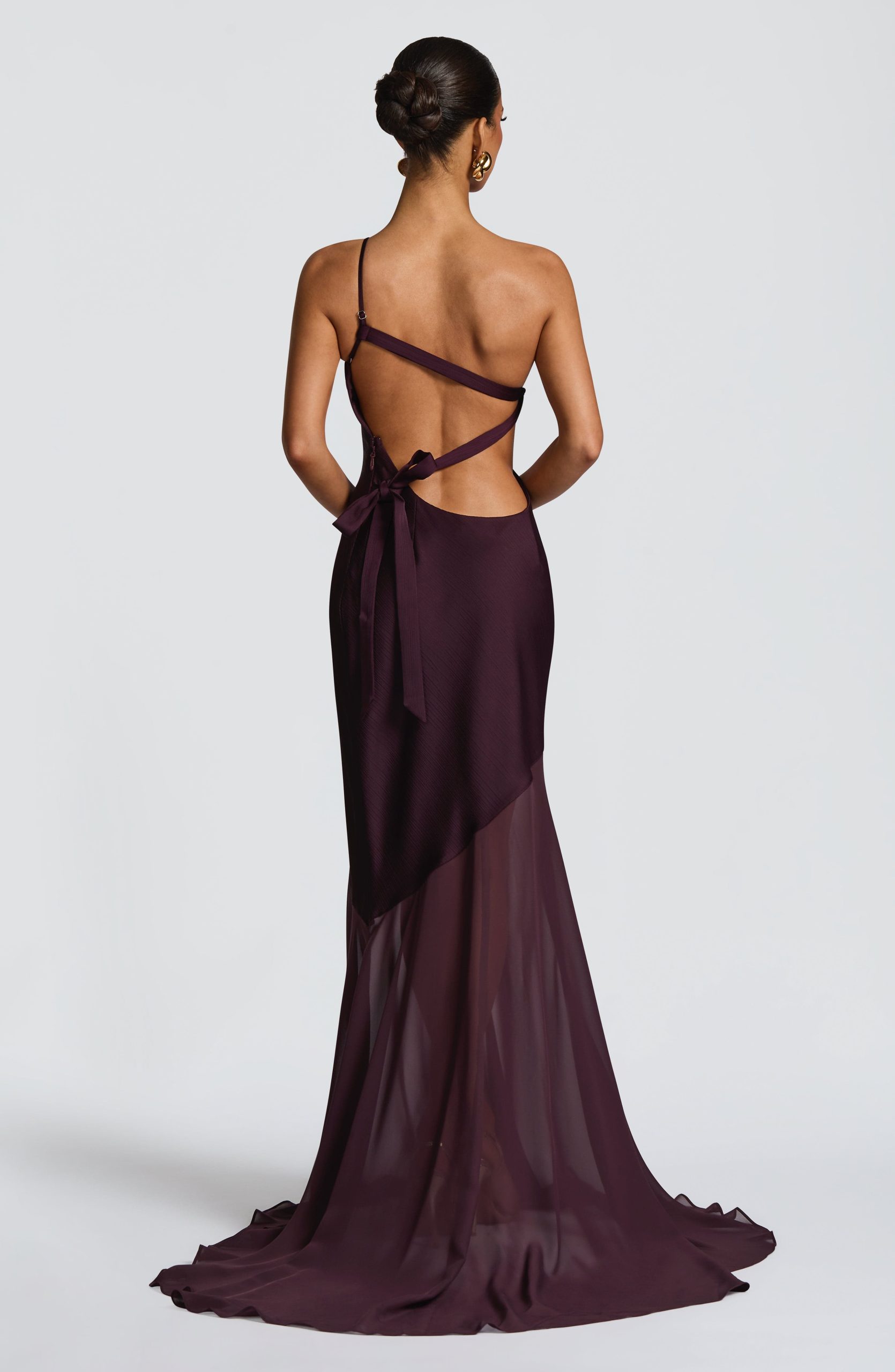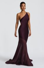 The Fable Gown in plum combines textured satin with a contrast, semi-sheer chiffon skirt. Featuring a bias cut and an asymmetric one-shoulder neckline, it offers an open back with cross straps tied at the hip. The fishtail flared skirt extends into a subtle train.