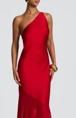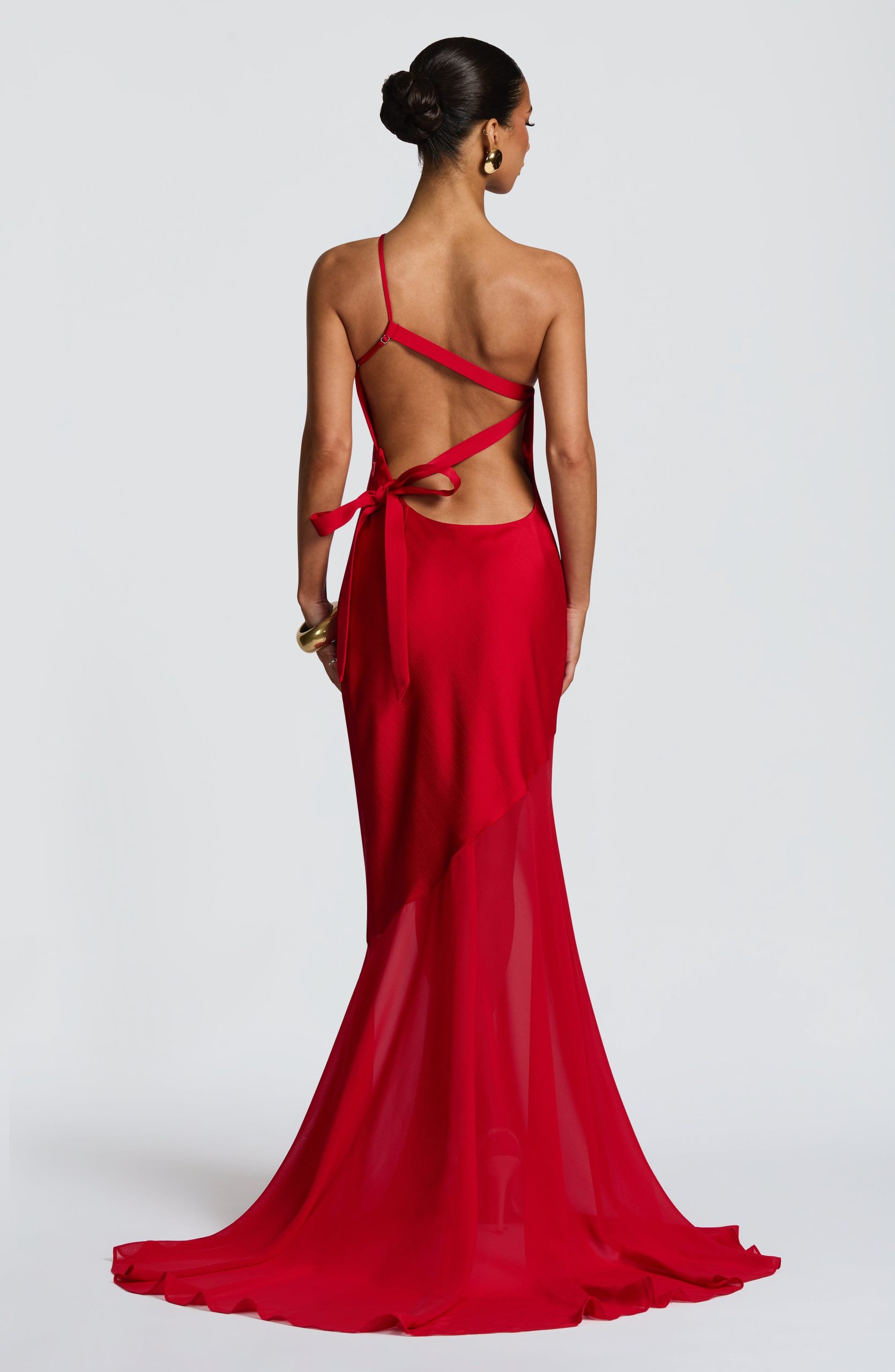 The Fable Gown in red combines textured satin with a contrasting semi-sheer chiffon skirt. Featuring a bias cut and an asymmetric one-shoulder neckline, it highlights an open back with cross straps tied at the hip. The fishtail skirt flares elegantly with a graceful train.