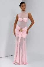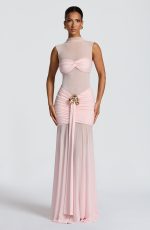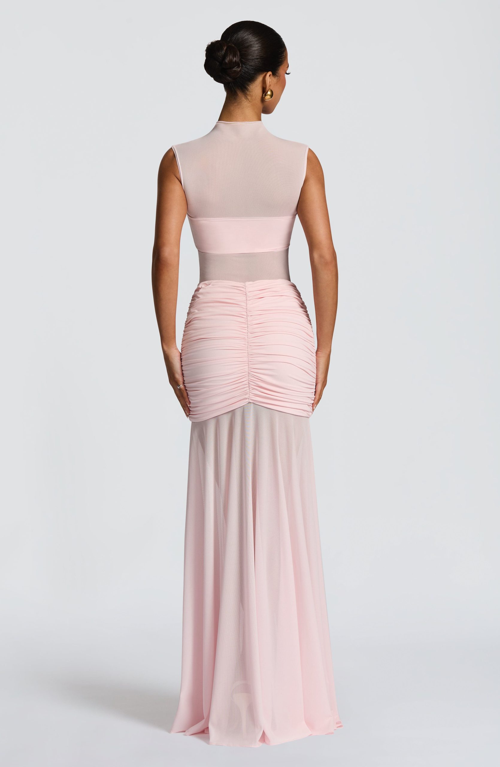 The Fae Maxi Skirt in blush features a sleek fitted hip with elegant ruching, flowing into a sheer, flared mesh skirt. Its V-shaped waist and long decorative front panel enhance its sophisticated silhouette. A removable orchid brooch adds a refined, customizable touch.