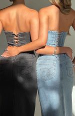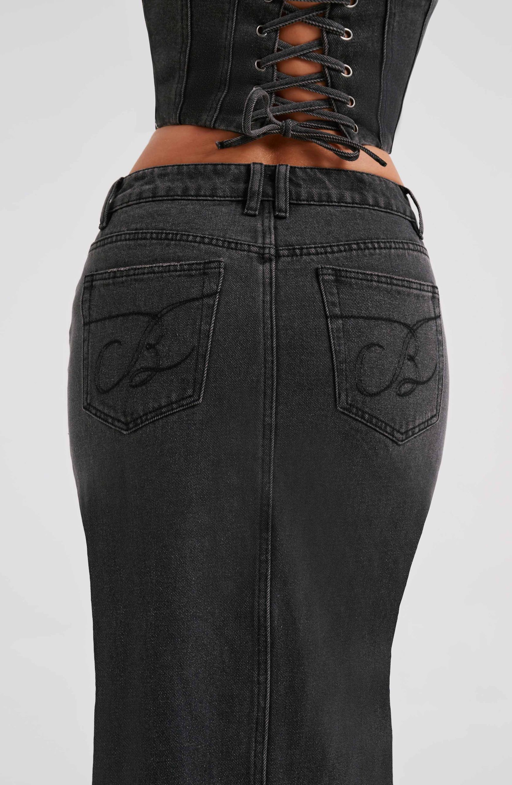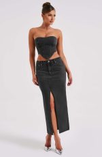 Do double denim to perfection with the Flor maxi skirt and Yasie corset. Our new denim maxi skirt features a high waist fit, middle split and button and zip fastening.