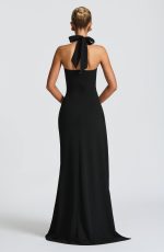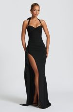 Indulge in luxurious elegance with our Genette Maxi Dress in classic black. Crafted from stretch crepe, it features underwired cups and halter neck ties for a flattering fit. Asymmetrical pleating on the bodice and a draped detail with a thigh high split add a touch of sophistication to this exclusive piece.