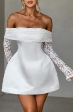 Featuring a rounded bubble shaped skirt, cinched waist and long, floral lace sleeves, Georgianna’s on our new season wishlist. The design is made from luxe non-stretch satin, contrasted by delicate lace sleeves and fold-over bardot neckline.