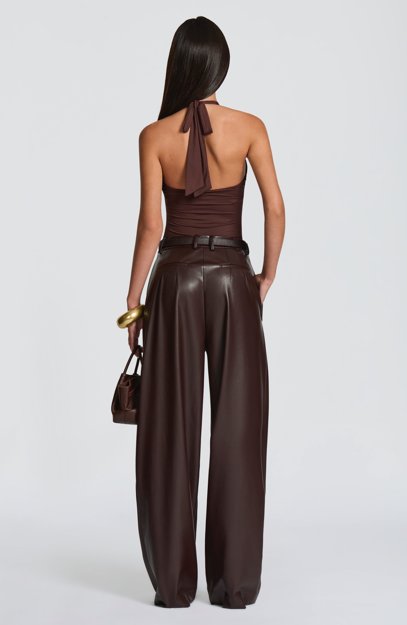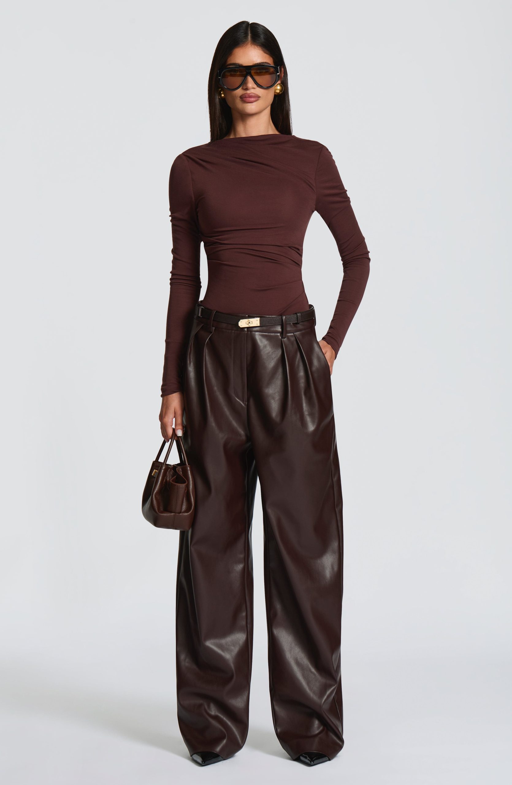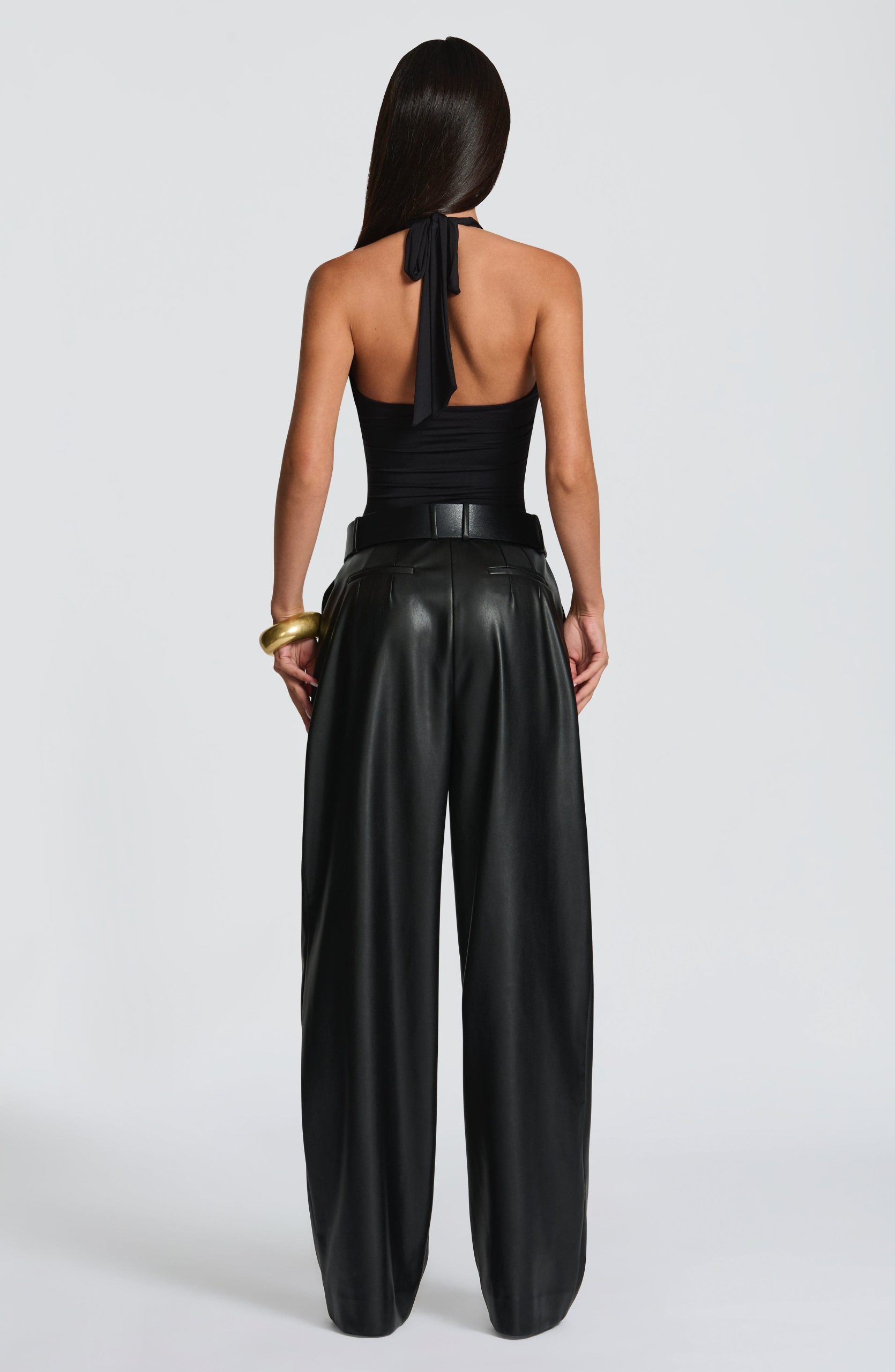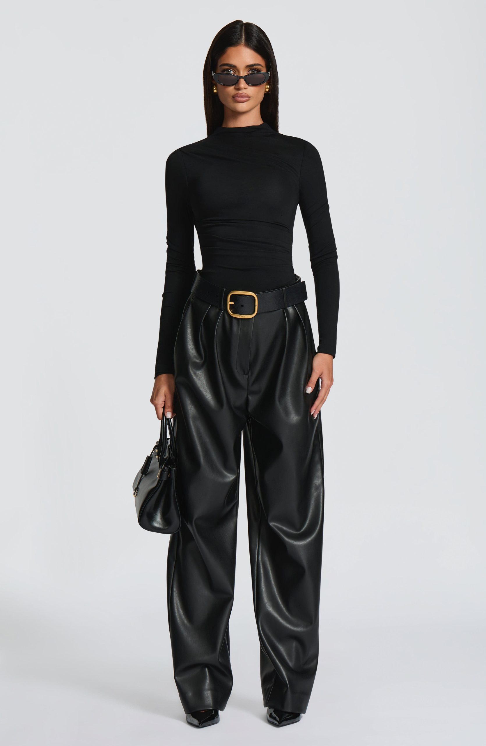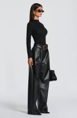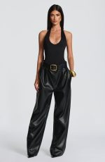 Glenda Pants in black faux leather offer a sophisticated oversized fit with a mid-rise waist and wide legs. Featuring a fly zip closure, double pleats on the legs, front slanted pockets, and twin welt pockets at the back, they combine elegance with modern comfort.