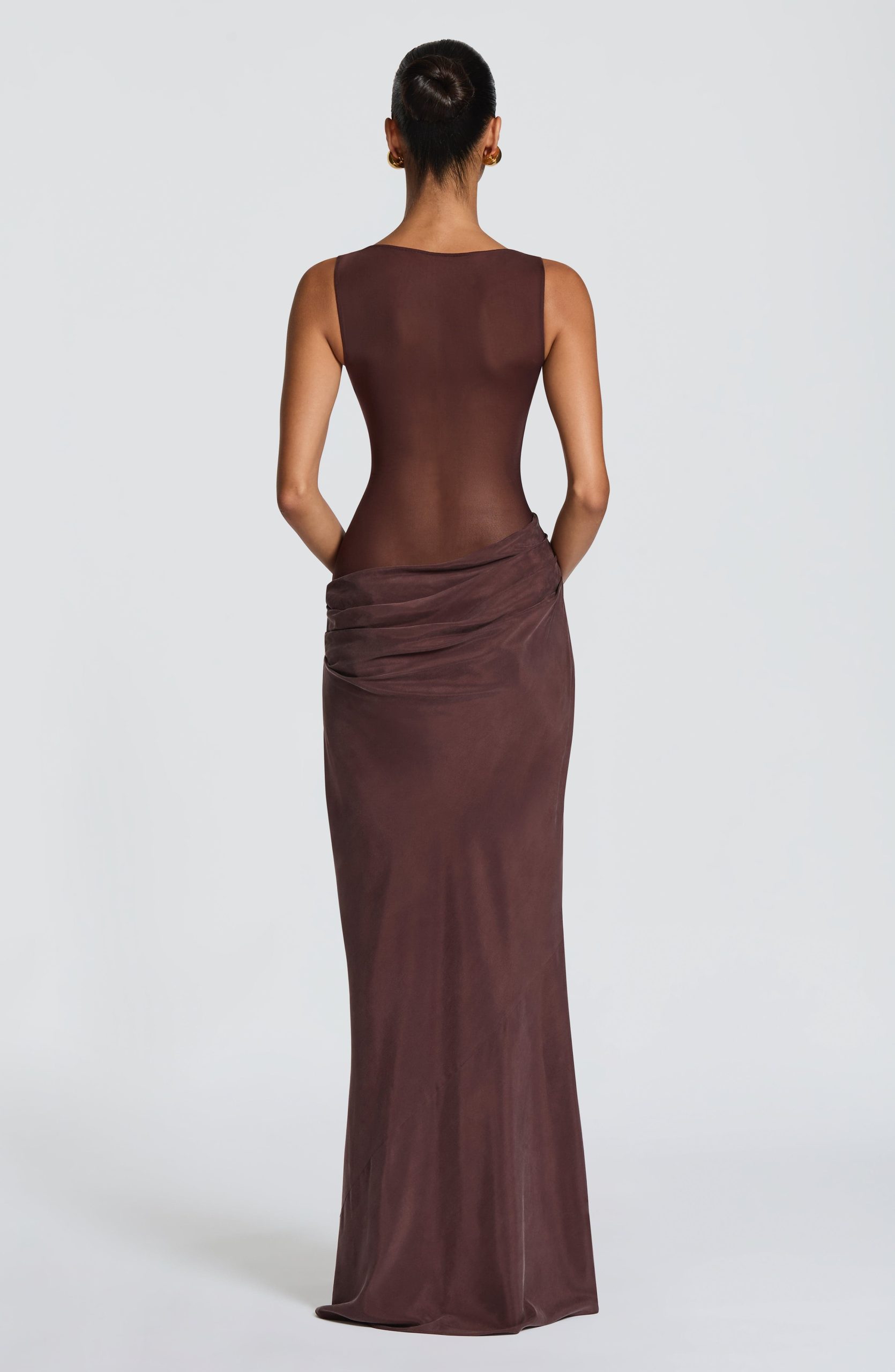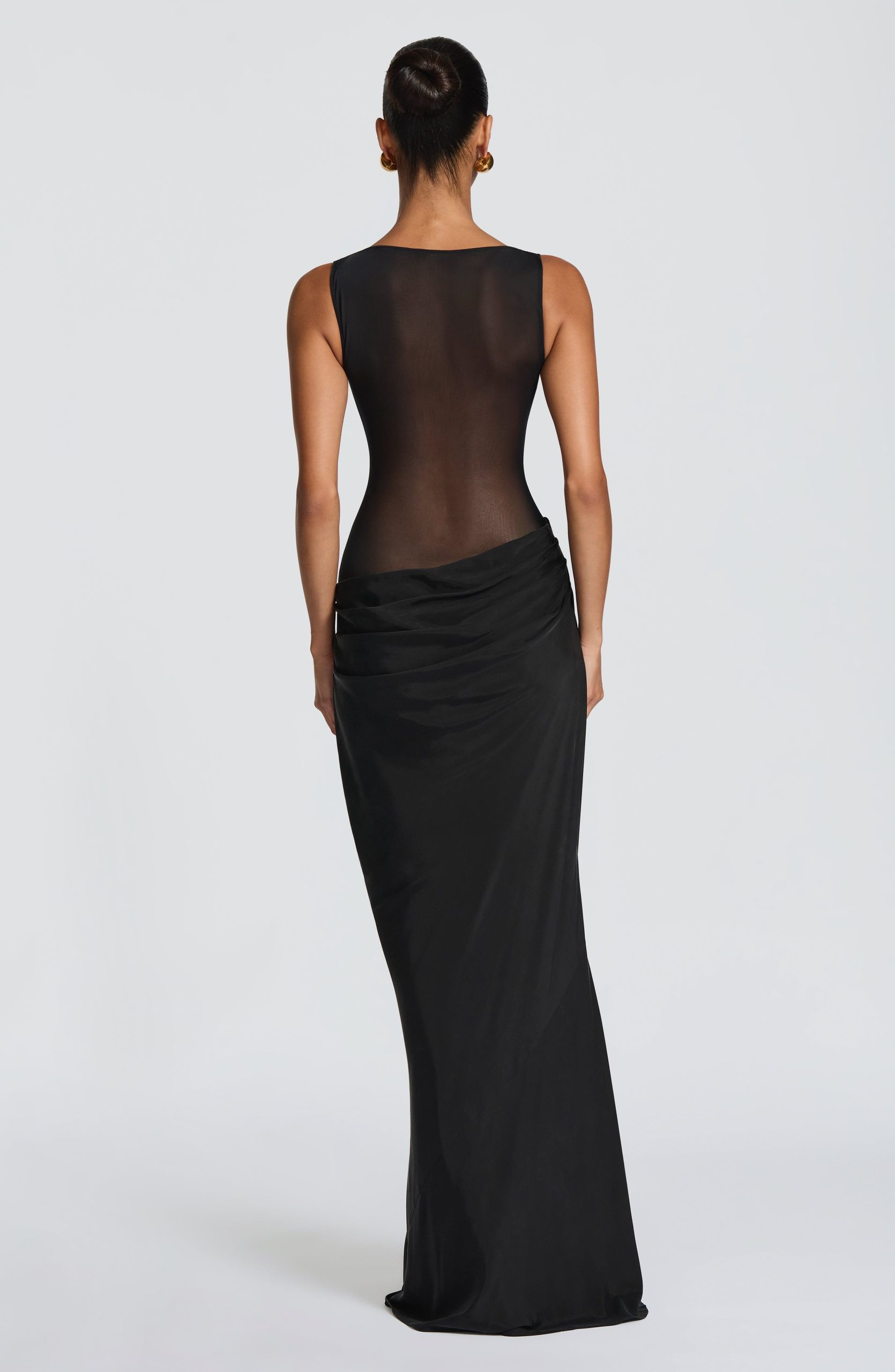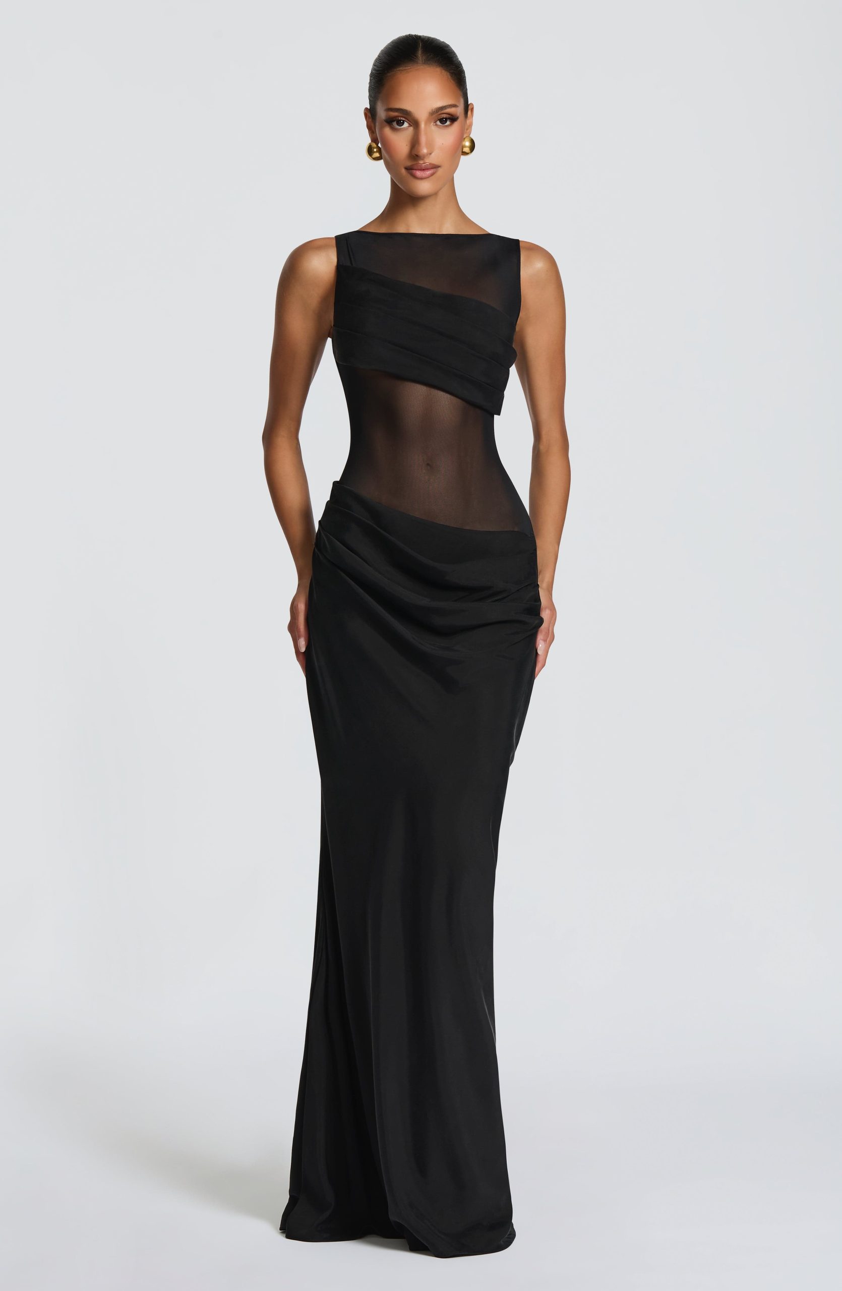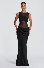 The Gracelyn Maxi Dress in black has a sheer mesh bodice with boat neckline frames the angled, pleated bust panel, while the asymmetric dropped waist and bias-cut Cupro skirt create a graceful silhouette. Pleat detailing across the hips adds movement and dimension.