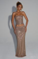 Elevate your wardrobe with the Hali Maxi Skirt in plum brown. Featuring a mid-rise fit and elastic waistband for comfort, this maxi skirt is adorned with square hotfix rhinestones for subtle sparkle. Fully lined in mesh, it offers a semi-sheer, elegant silhouette perfect for refined occasions.