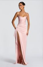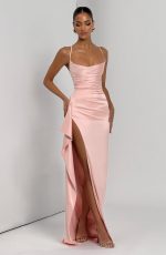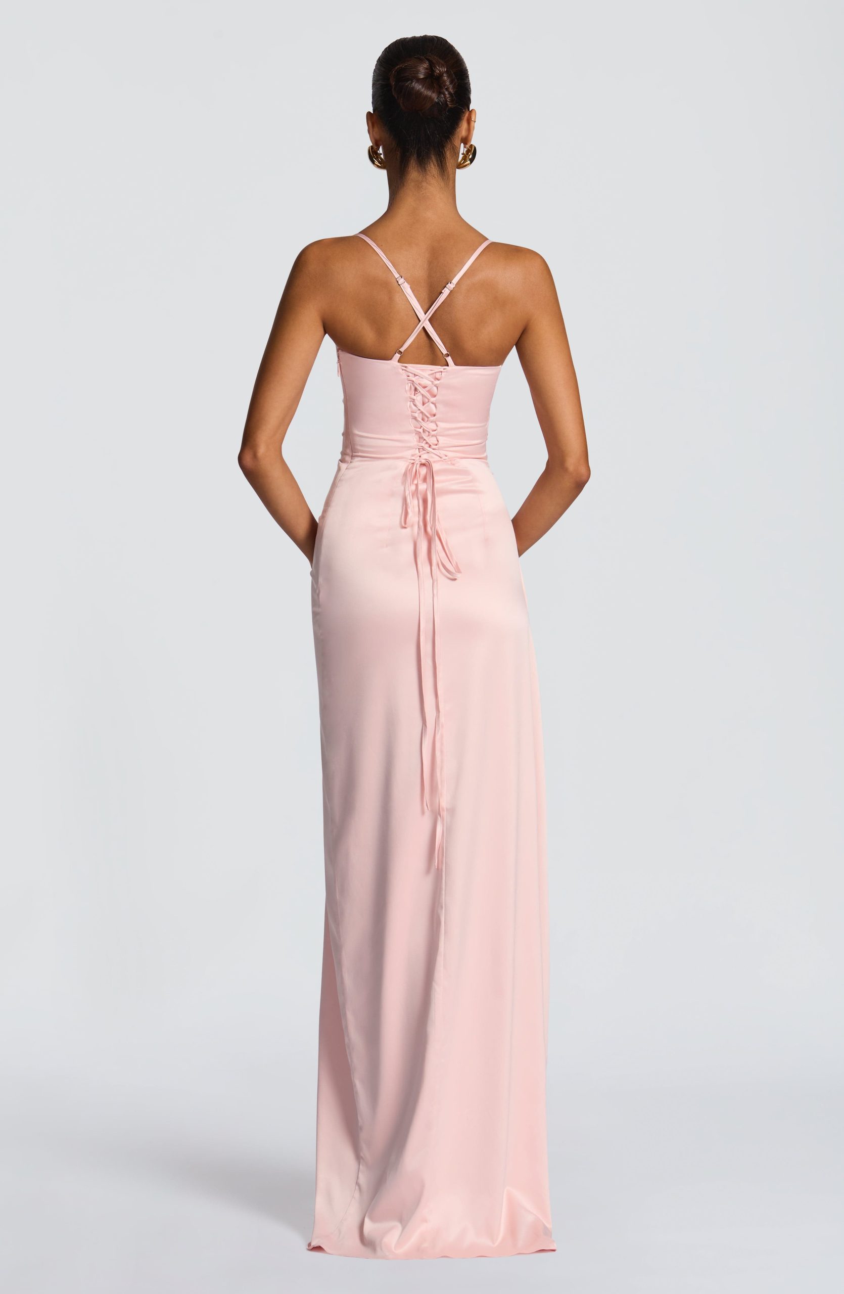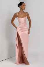 The Helen Maxi Dress in blush features stretch satin with a twist cowl neckline, crossed shoulder straps, and a lace-up back for a tailored fit. Its asymmetric pleated bodice and draped thigh-high split create an elegant, refined silhouette.