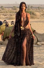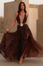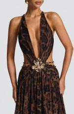 The Indianna Maxi Dress in leopard print features a plunging neckline, statement brooch with beaded chains, and a backless design with crossover tie straps for a refined, elegant look.