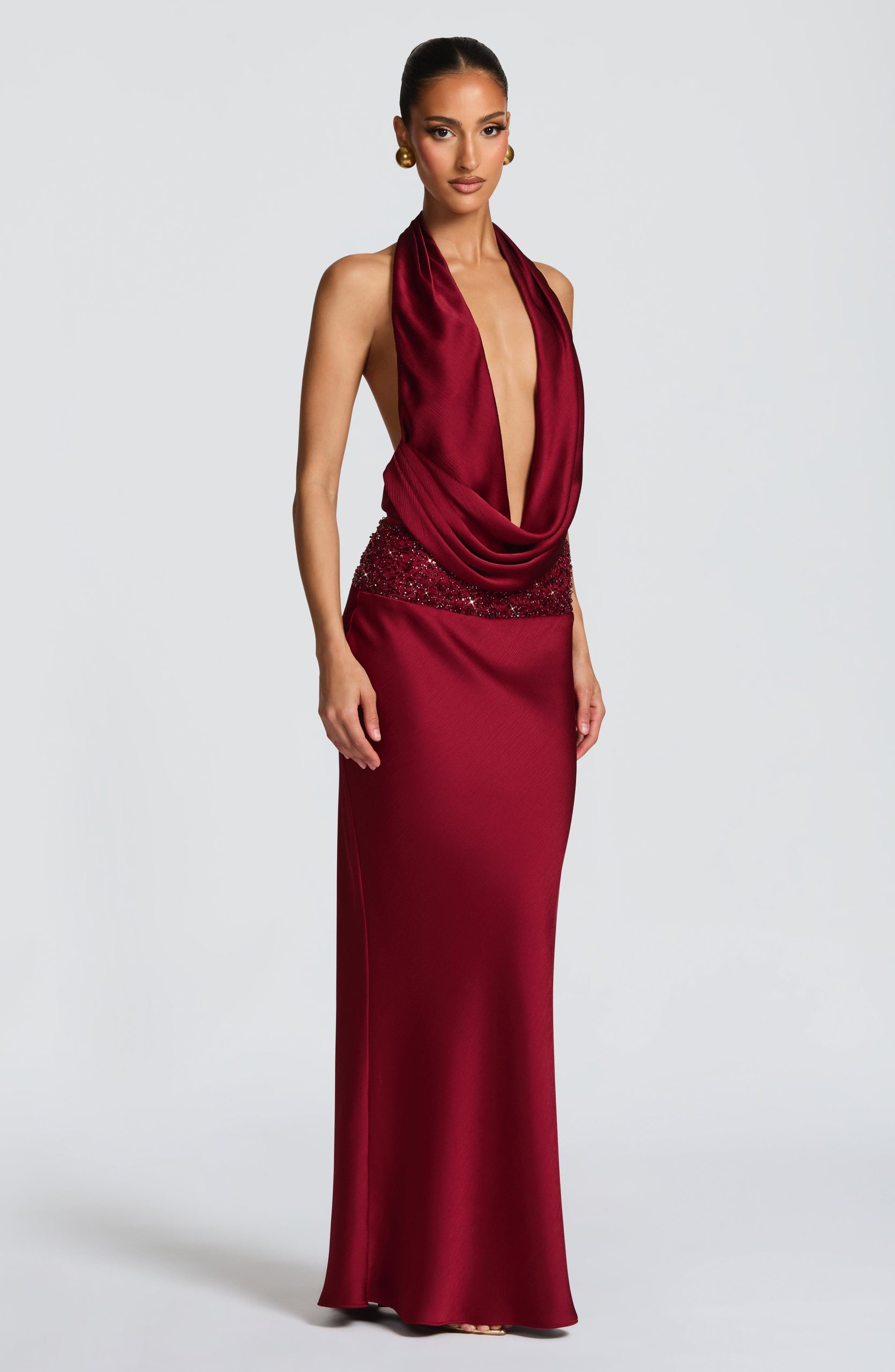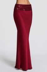 Indulge in luxury with the Ira Maxi Skirt in rich burgundy. Its textured satin fabric and bias cut provide a figure-flattering drape, while the wide embellished waistband adds a touch of elegance. With a mid-rise and sweeping maxi length, this skirt exudes sophistication and style.