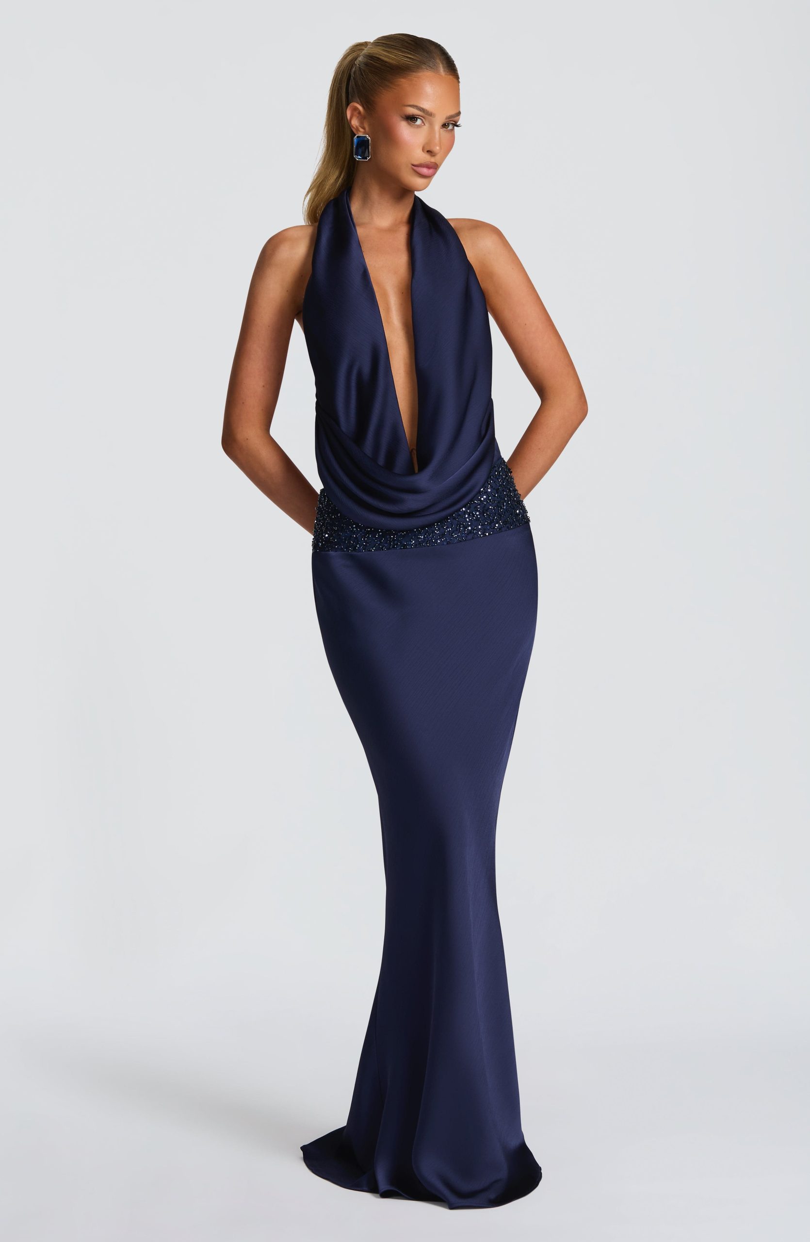 The Ira Maxi Skirt in navy combines fluid elegance with refined detail. Crafted from textured satin and cut on the bias for a graceful drape, this mid-rise silhouette features a striking embellished waistband that elevates the maxi length.