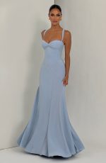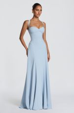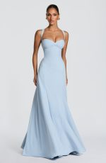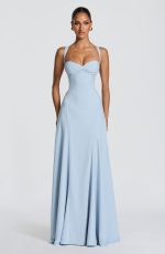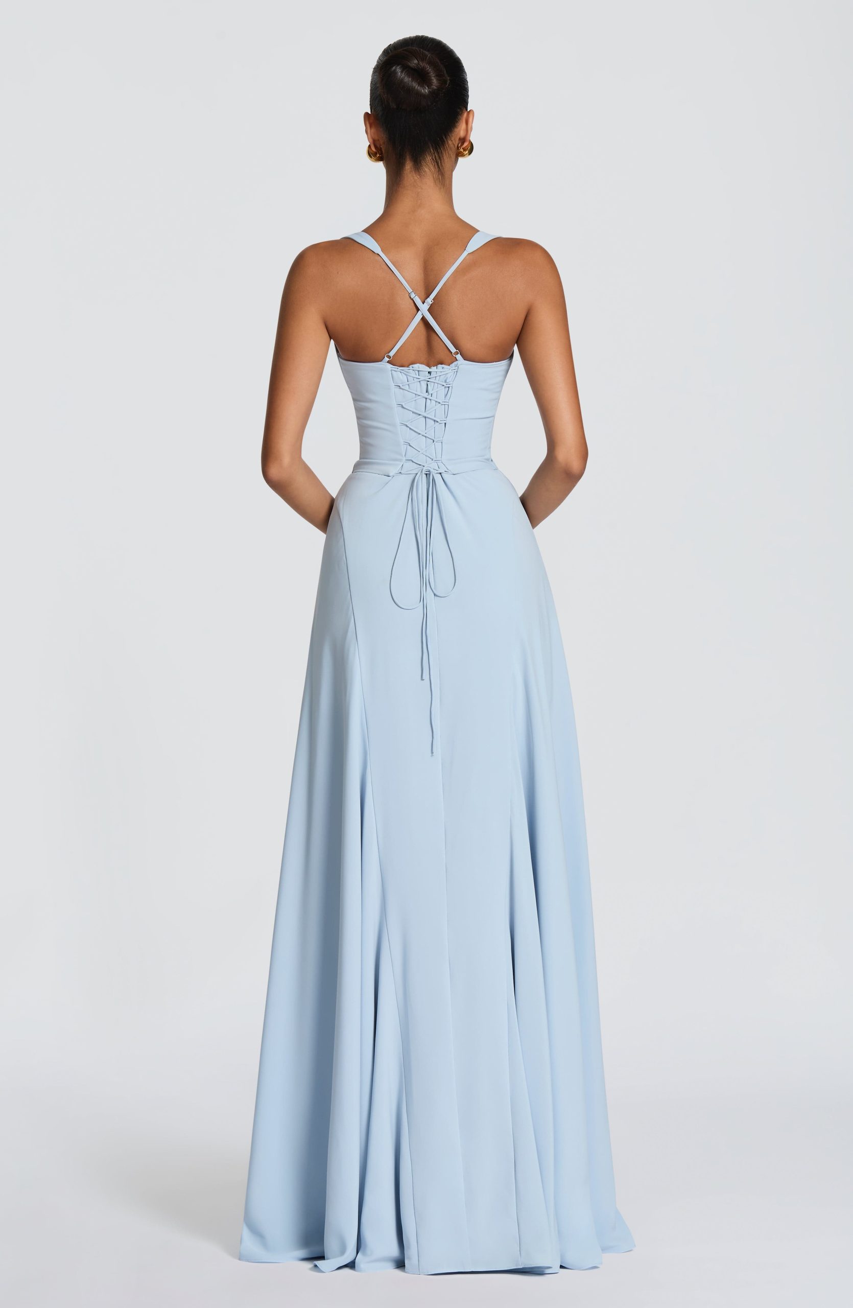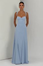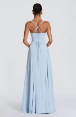 The Irie Maxi Dress in Glacier Blue features a sweetheart neckline with underwired cups, fitted bodice, and flared hem with godet panels. Tapered straps and a lace-up back offer customizable support and a cinched silhouette. Crafted in flowing chiffon for effortless elegance.