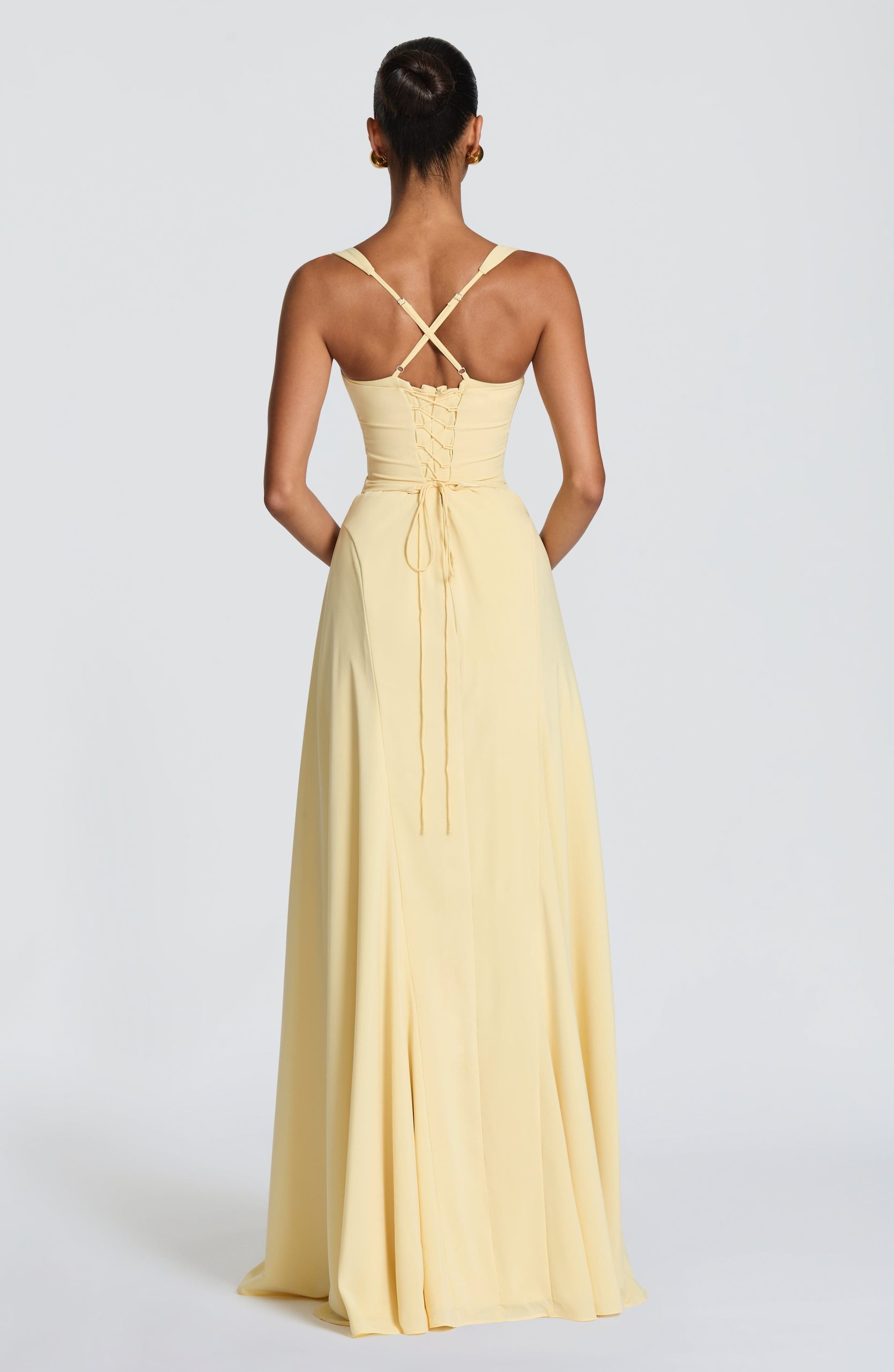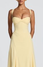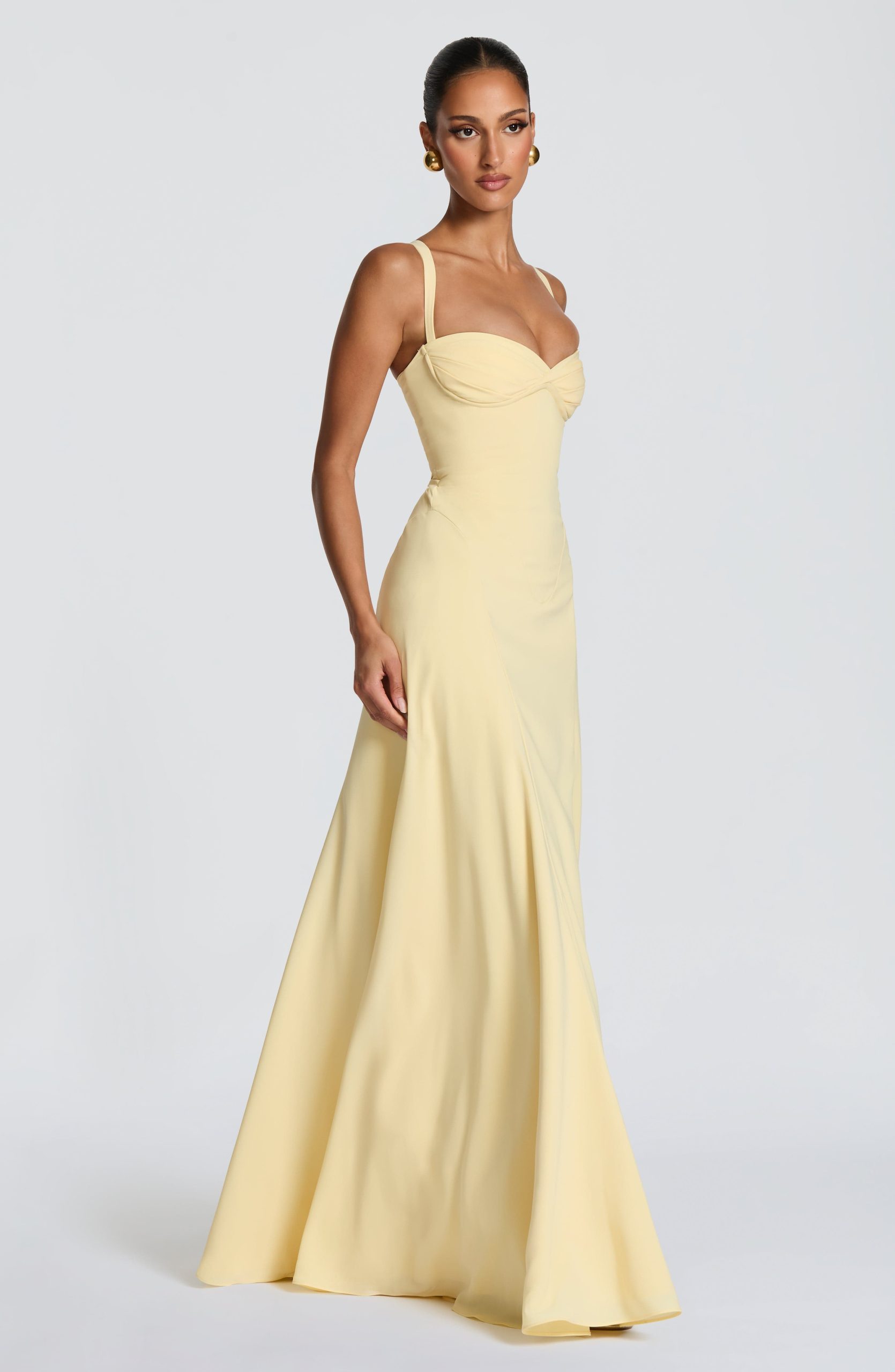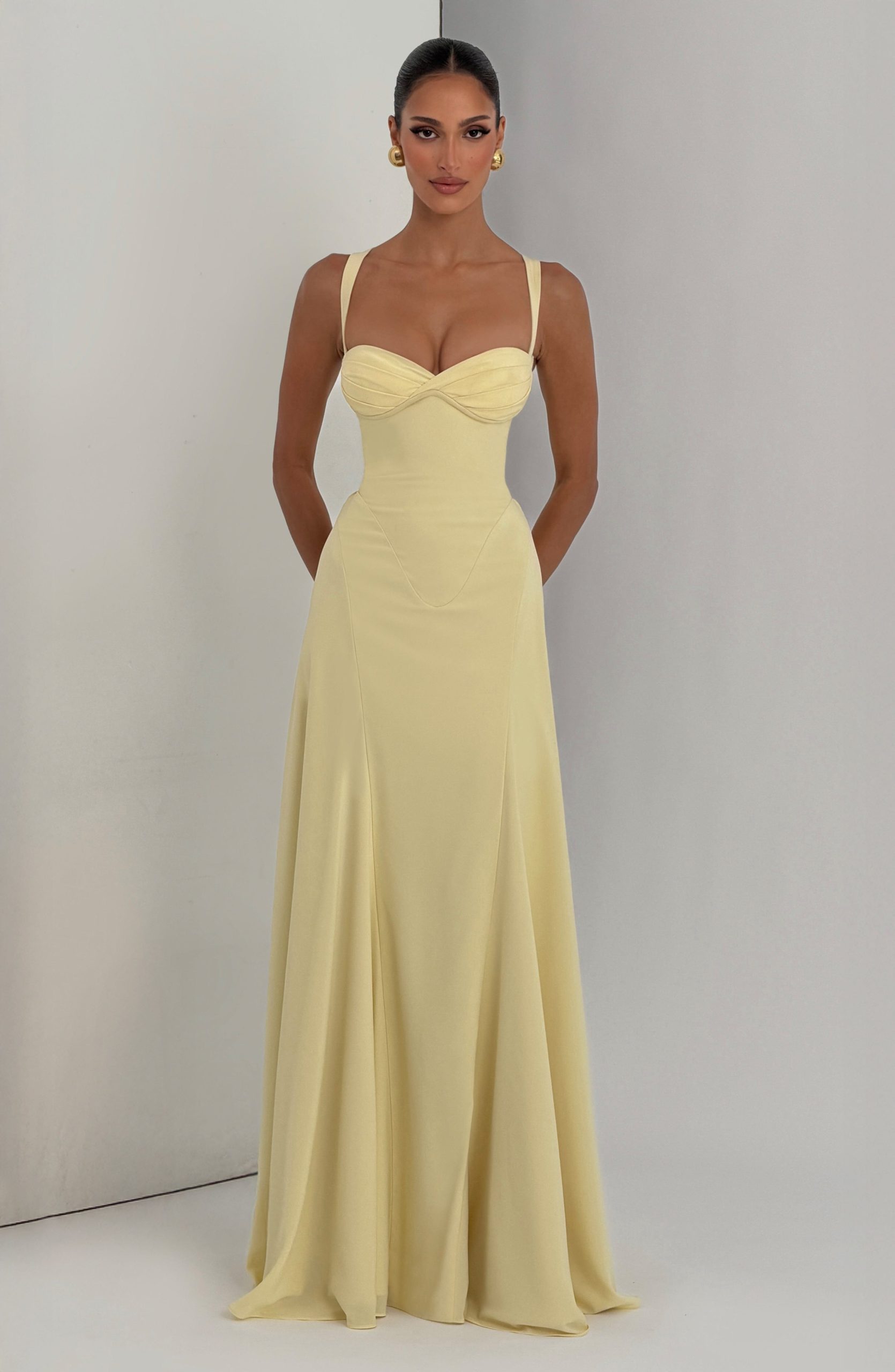 Irie Maxi Dress in lemon has a sweetheart neckline, underwired pleated cups, and tapered straps. The fitted bodice flows into a flared hem with hip godet panels, while the lace-up back cinches for a customizable fit. Sophisticated and versatile for any occasion.