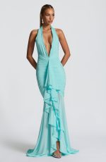 The Janessa Maxi Dress in Aqua features a soft stretch mesh fabric with a deep plunge neckline and elegant halter straps. Its waterfall split and delicate ruffle edges add graceful movement, while ruching across the hips enhances the silhouette. The semi-sheer skirt completes this sophisticated look with subtle allure.