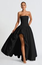 Indulge in luxury with our Jillian Maxi Dress in black. The maxi length and strapless neckline exude elegance, while the dropped waist and ruched detail flatter your figure. The lace-up back adds a touch of drama, and the puff ball skirt and thigh high split add a playful edge. Elevate your style with this exclusive piece.