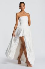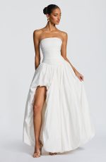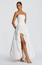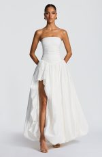 The Jillian Maxi Dress in ivory features a strapless neckline and a ruched bodice with a lace-up back for a tailored fit. Its dropped waist flows into a dramatic puff ball skirt with a thigh-high split, combining elegance with a bold, sophisticated silhouette.