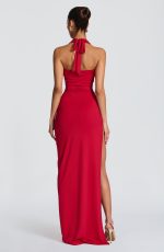 The Kingsley Maxi Dress in red is crafted from a stretchy, slinky jersey that gracefully hugs your silhouette. Its maxi length and deep plunging neckline with a soft draped cowl overlay exude refined elegance. A gathered twist detail at the hip complements the thigh-high split.