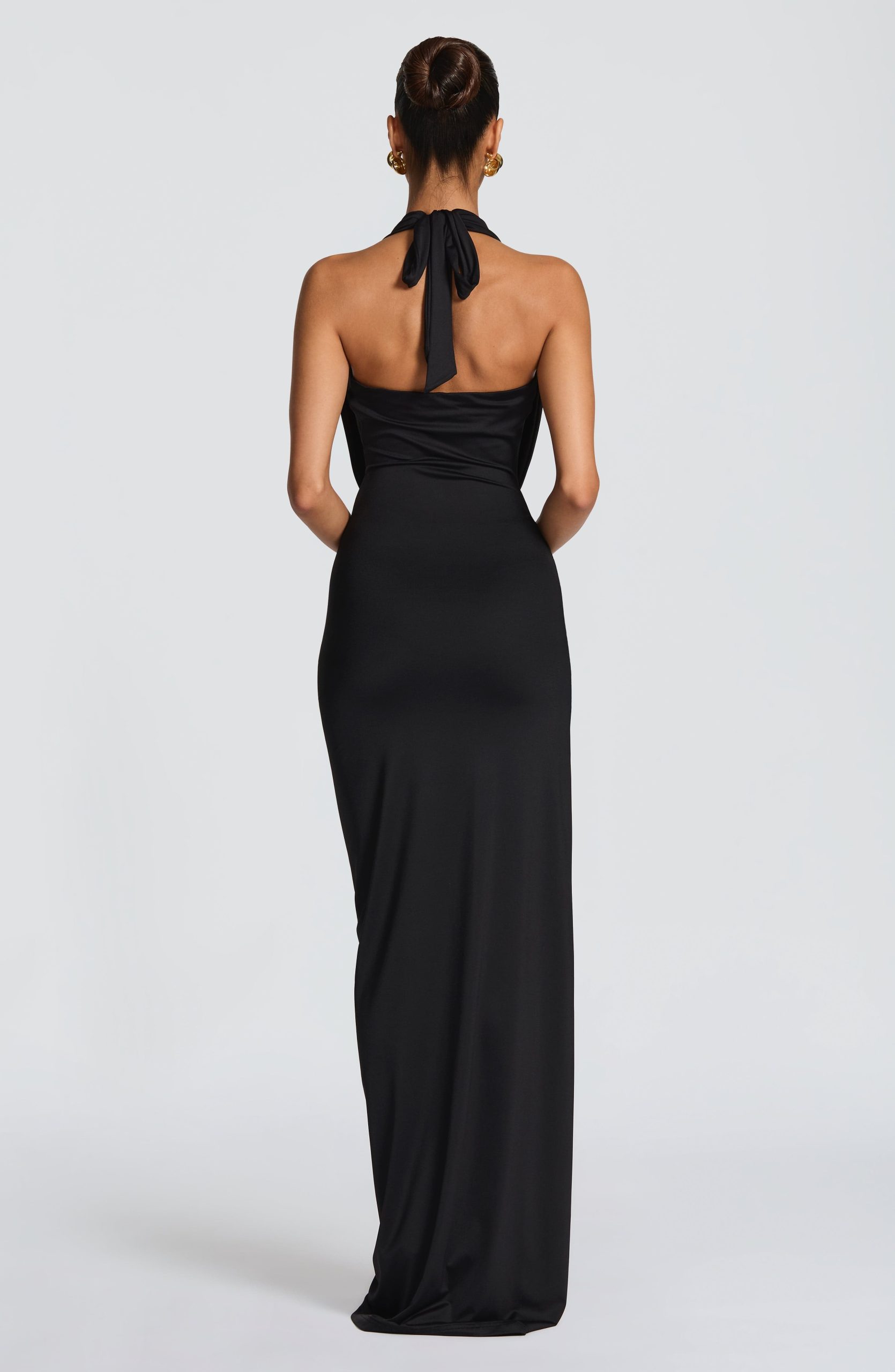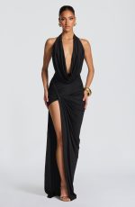 The Kingsley Maxi Dress is crafted from stretch slinky jersey, this floor-length silhouette features a plunging neckline softened by a draped cowl overlay and halter straps for refined support. A gathered twist detail at the hip creates movement, while the thigh-high split adds a touch of allure.