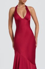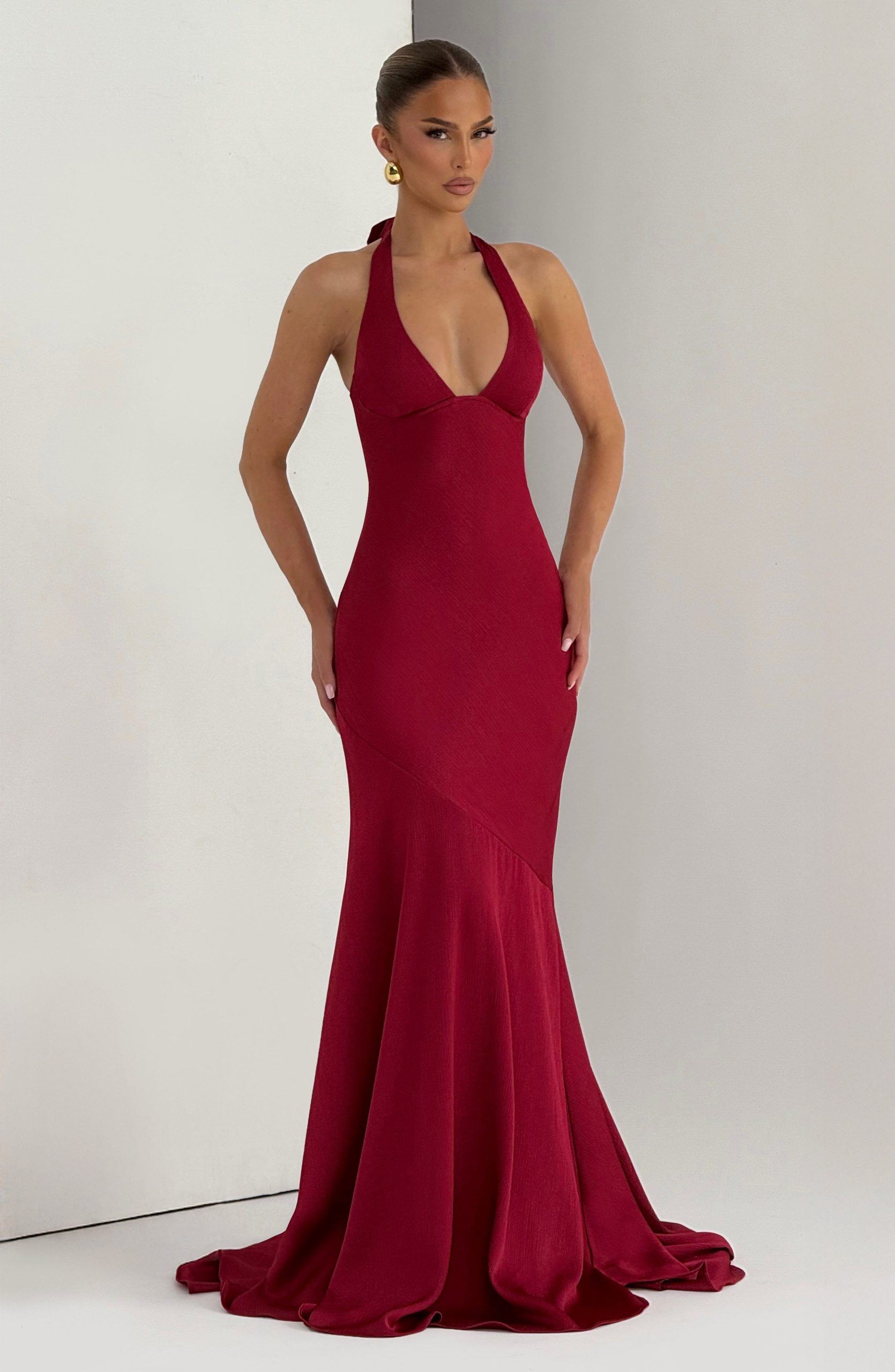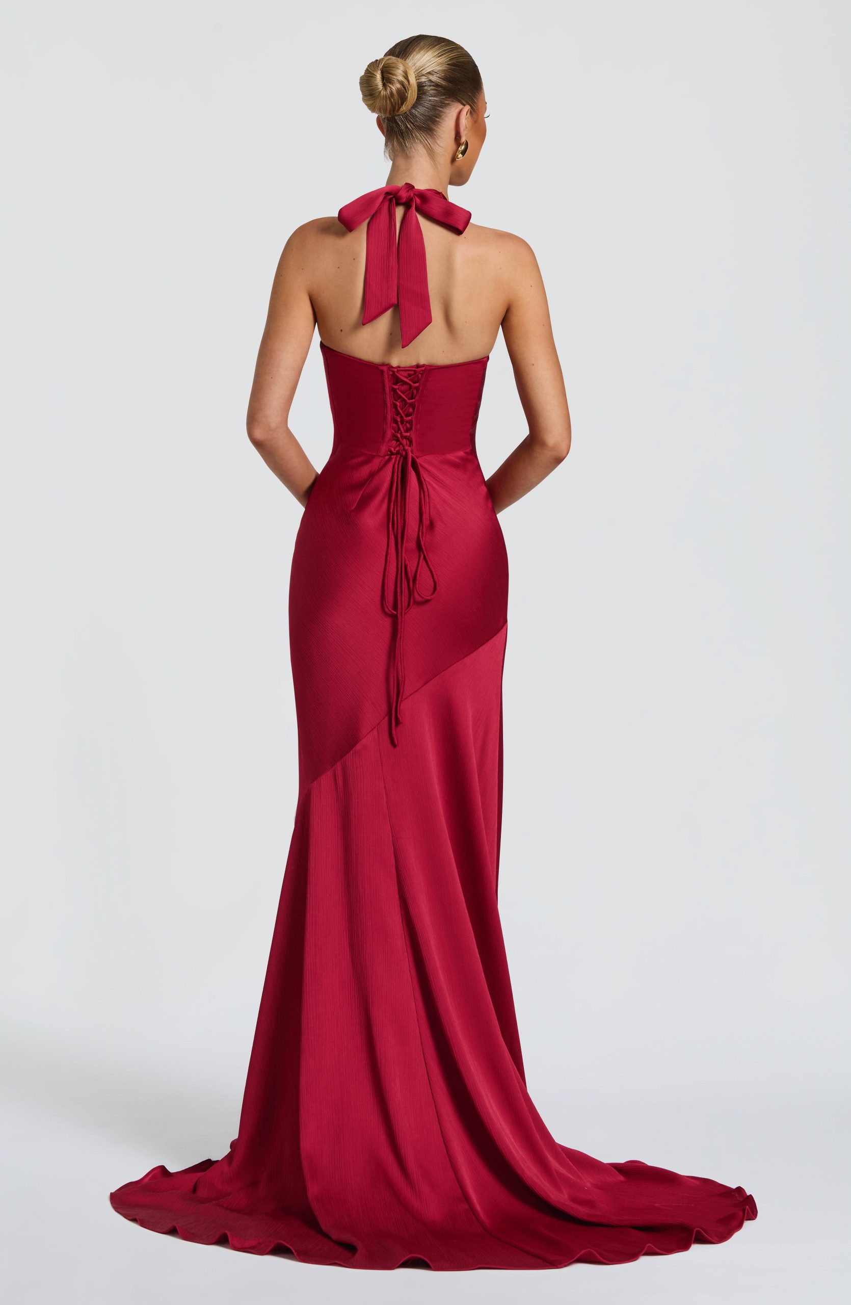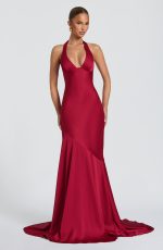 Kirsten Gown in berry features textured satin with an underwired plunge neckline and halterneck straps. The bias-cut bodice showcases an asymmetric seam, flowing into a floor-length skirt with flared hem and train for refined elegance.