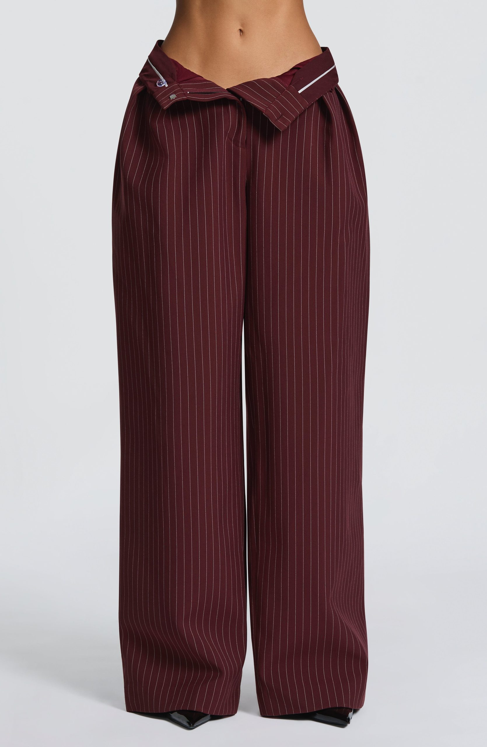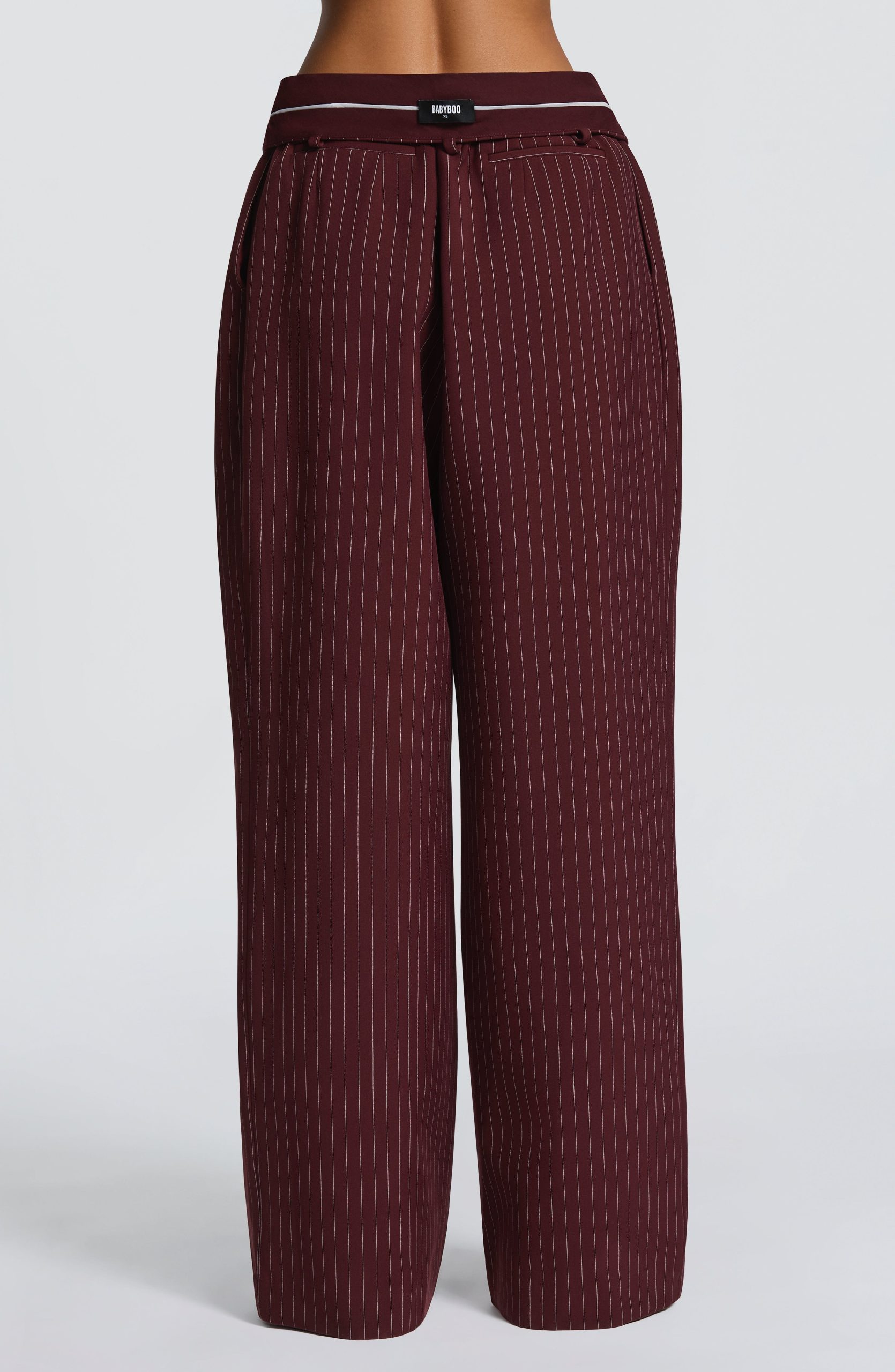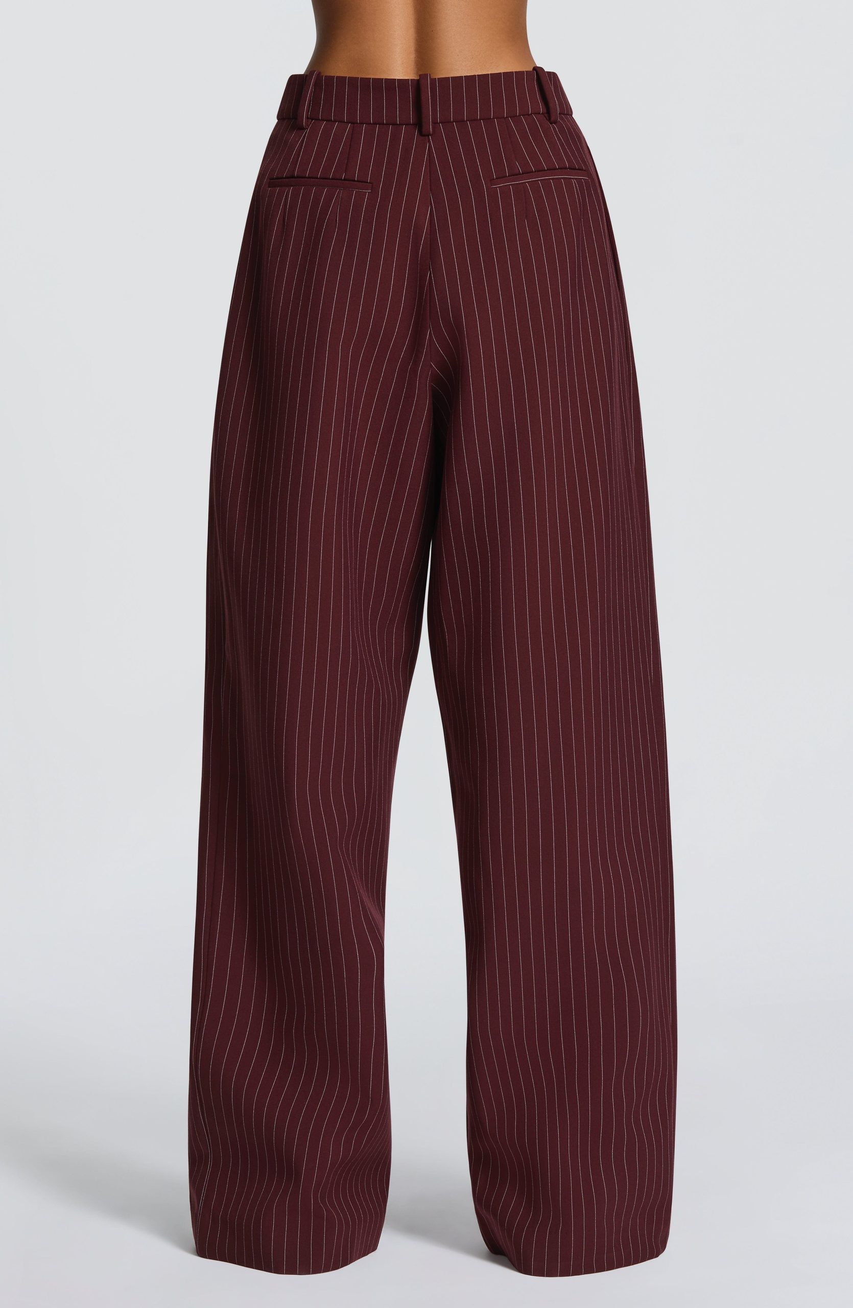 The Kirsty Pants in burgundy pinstripe deliver refined tailoring through a non-stretch woven suiting fabric. Designed with a mid-rise fit and generous wide leg, they feature signature double pleats and twin welt back pockets for understated elegance. Secured with a zip fly closure.