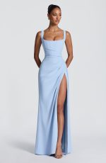 Laleh Maxi Dress in Glacier Blue. Crafted from drape twill with a scooped square neckline and directional pleating on the bodice. Features an internal corset with boning and lace-up back for a cinched silhouette, maxi length, and wrap detail skirt with thigh-high split.