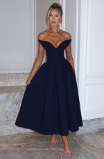 The epitome of elegance, Lanetta features a plunge bardot neckline with elasticated back strap bringing stylish flair. Falling to an effortlessly chic midi length, the design has a full, box pleated skirt and looks amazing paired with pointed heels and soft glam.
