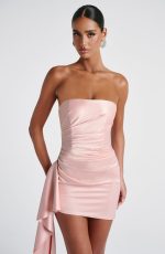 The Leoni Mini Dress in Blush is a stunning blend of modern elegance and chic design. Made from soft, stretch satin, this strapless dress is structured with internal boning in the bodice, ensuring a flattering and secure fit. The asymmetric hem adds a bold twist, while the draped frill detail at the hip and asymmetric pleats on the bodice create a beautifully dynamic silhouette.