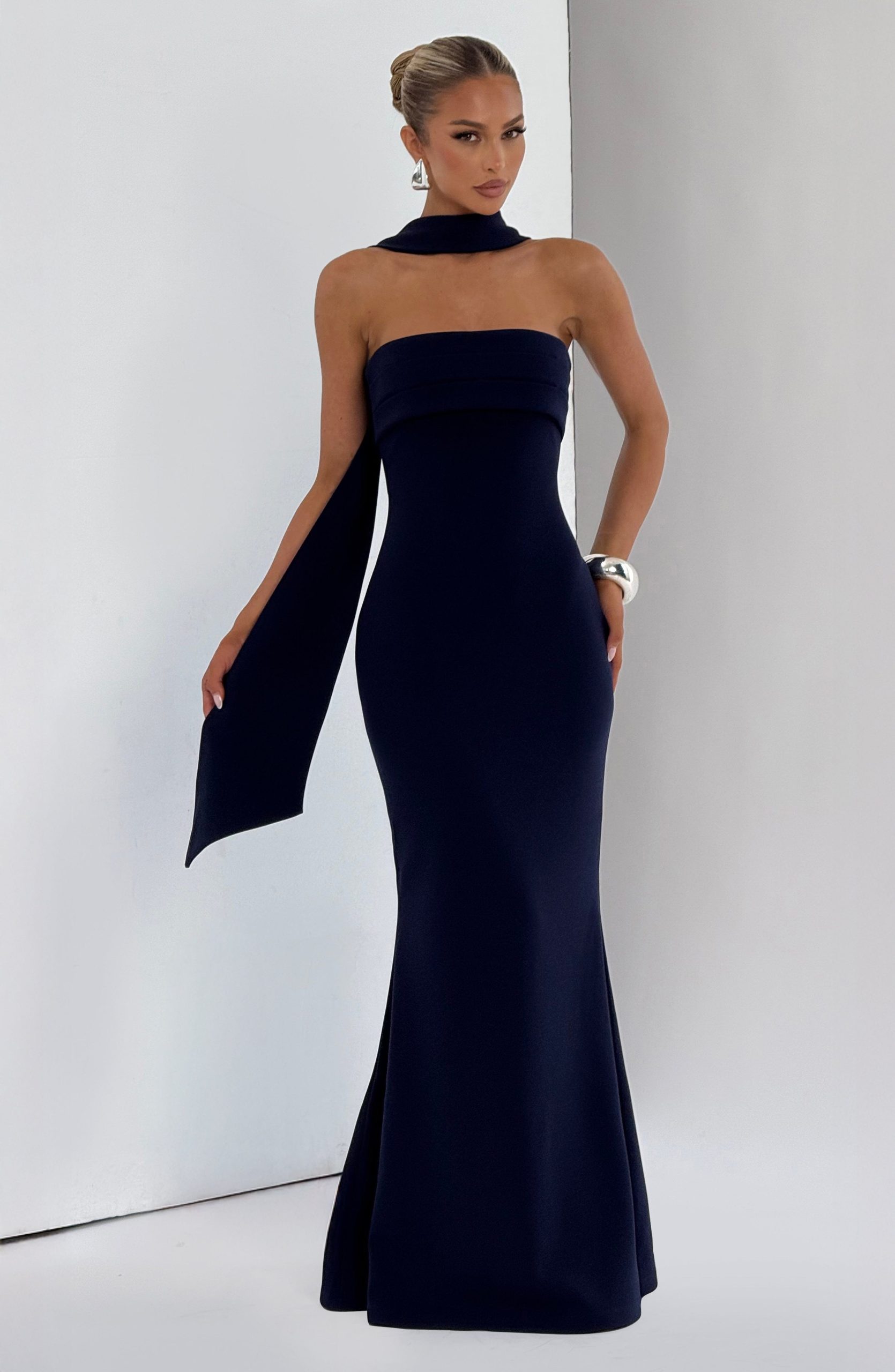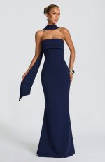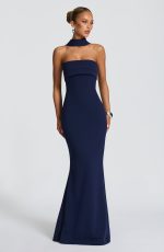 The Leura Maxi Dress in navy features a strapless, body-hugging bodice with a pleated panel across the bust, crafted from elegant stretch crepe. Its fit-and-flare maxi skirt offers graceful movement, perfect for sophisticated occasions.