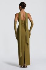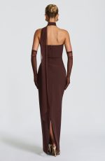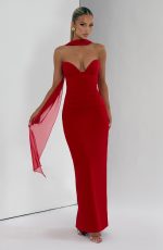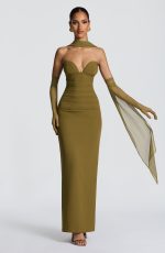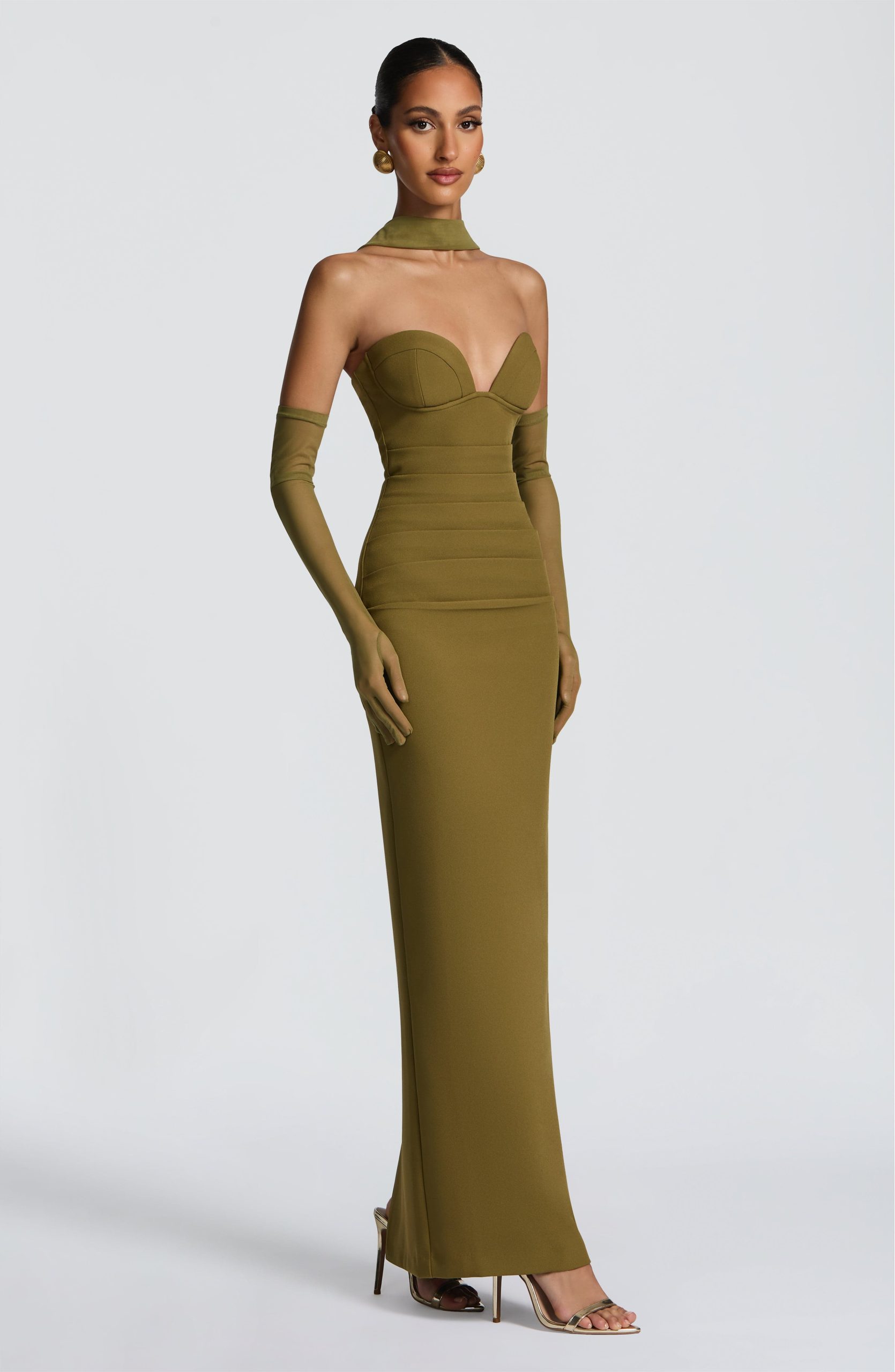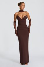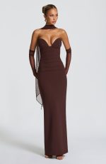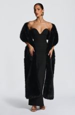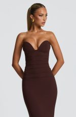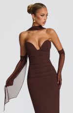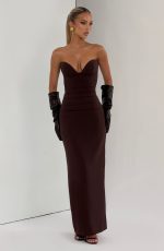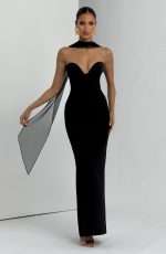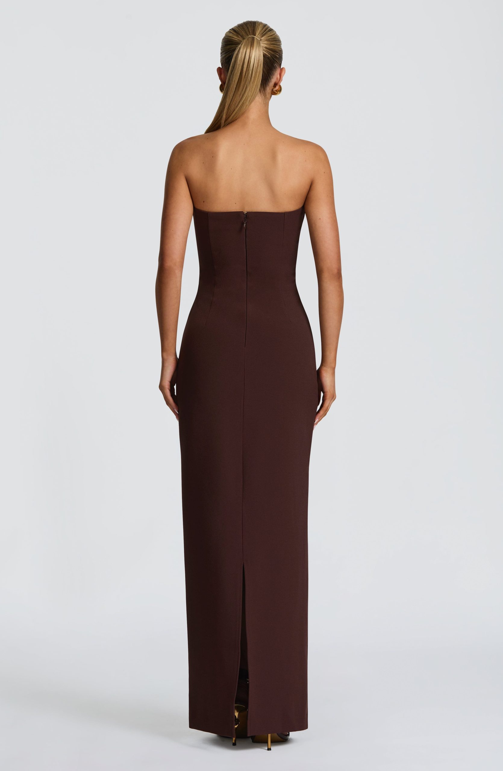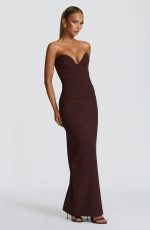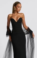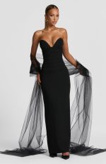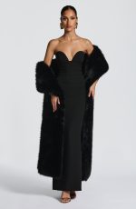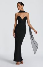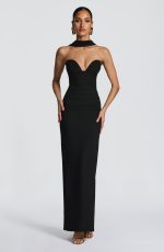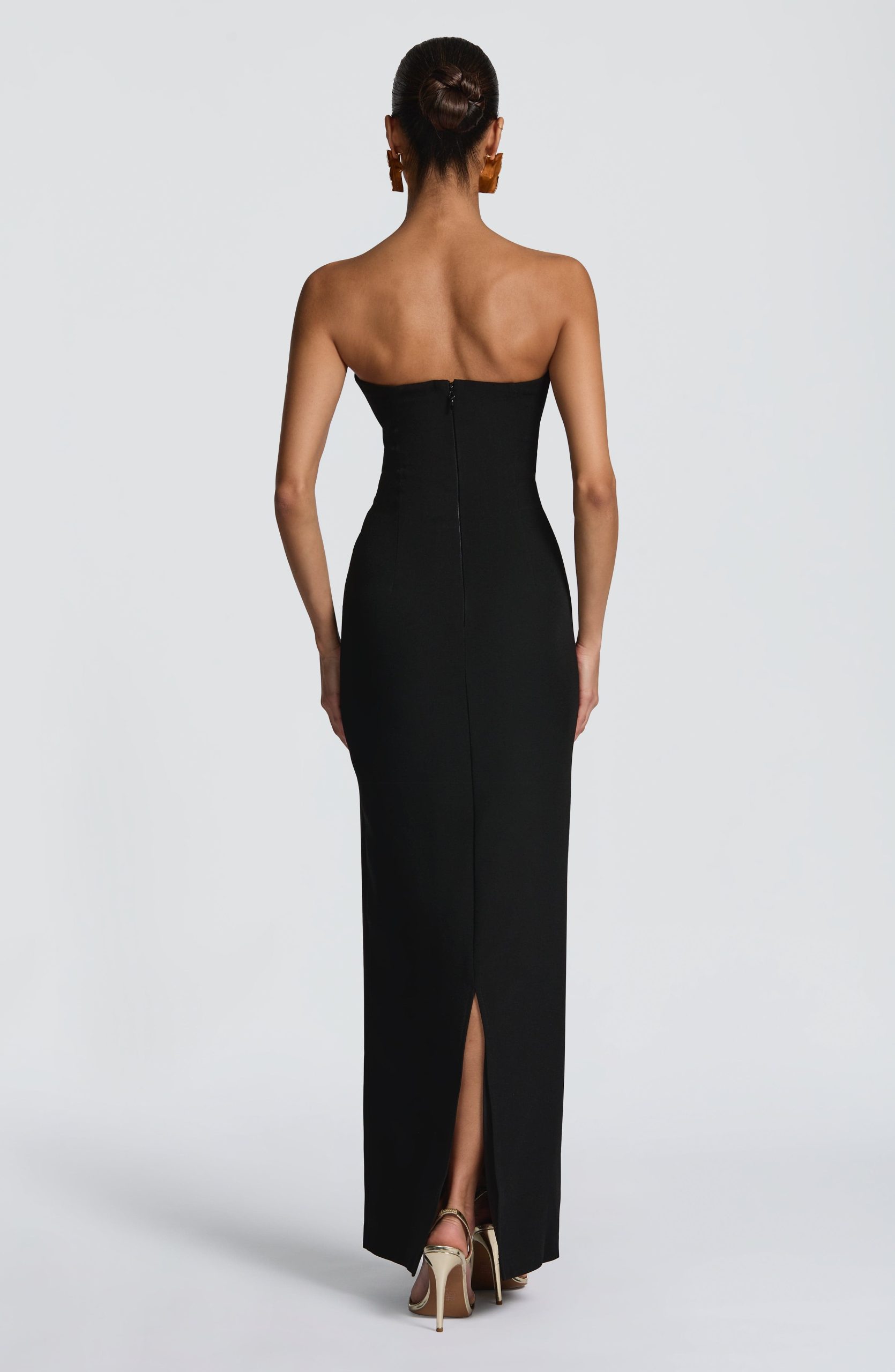 The Lindsey Maxi Dress in black features a strapless, cupped neckline with underwire and lightly padded cups for support and elegance. Crafted from non-stretch crepe, it offers a refined column silhouette with pleating at the waist and a centre back split for graceful movement.