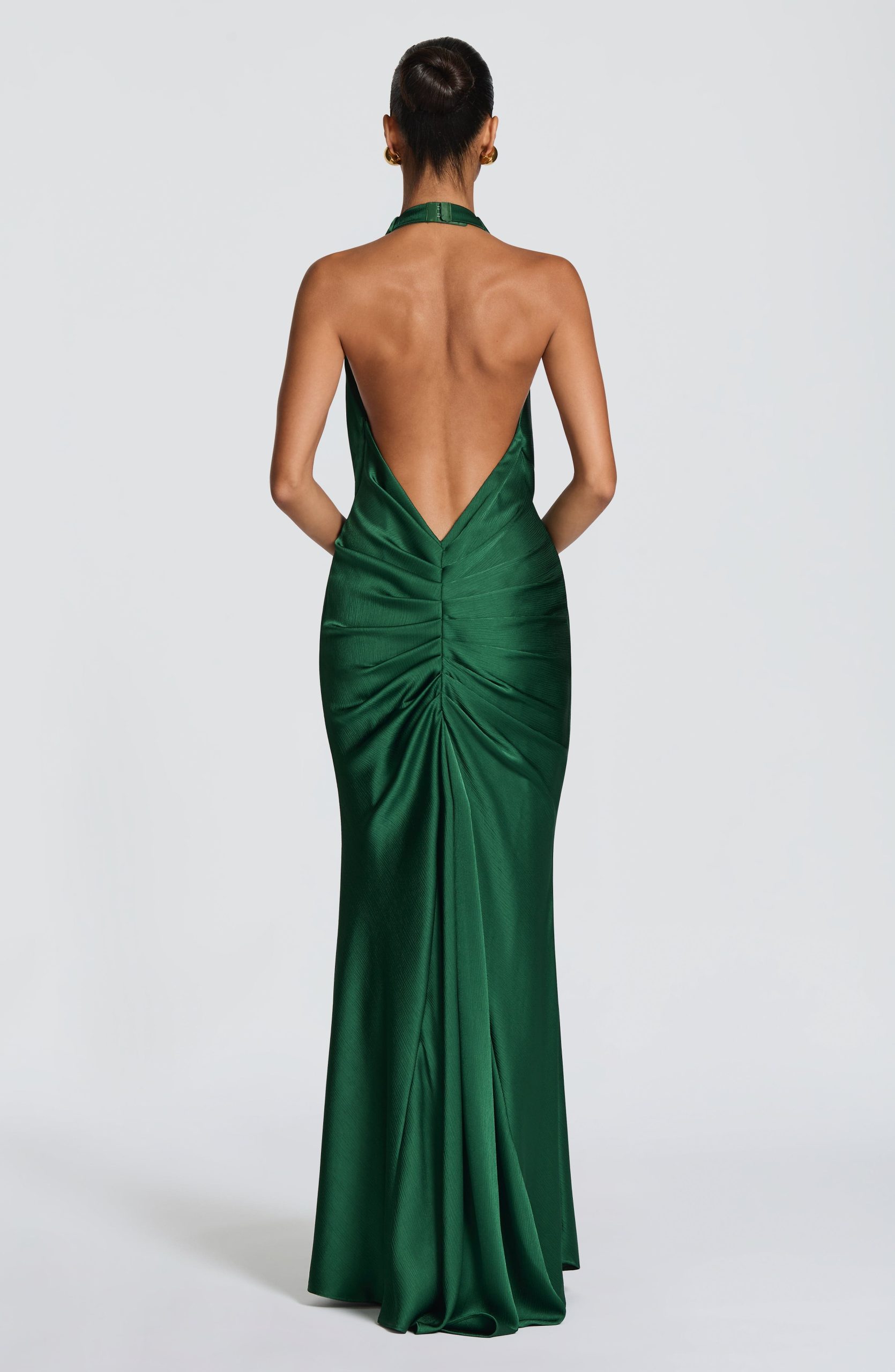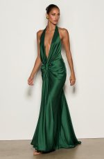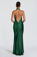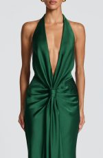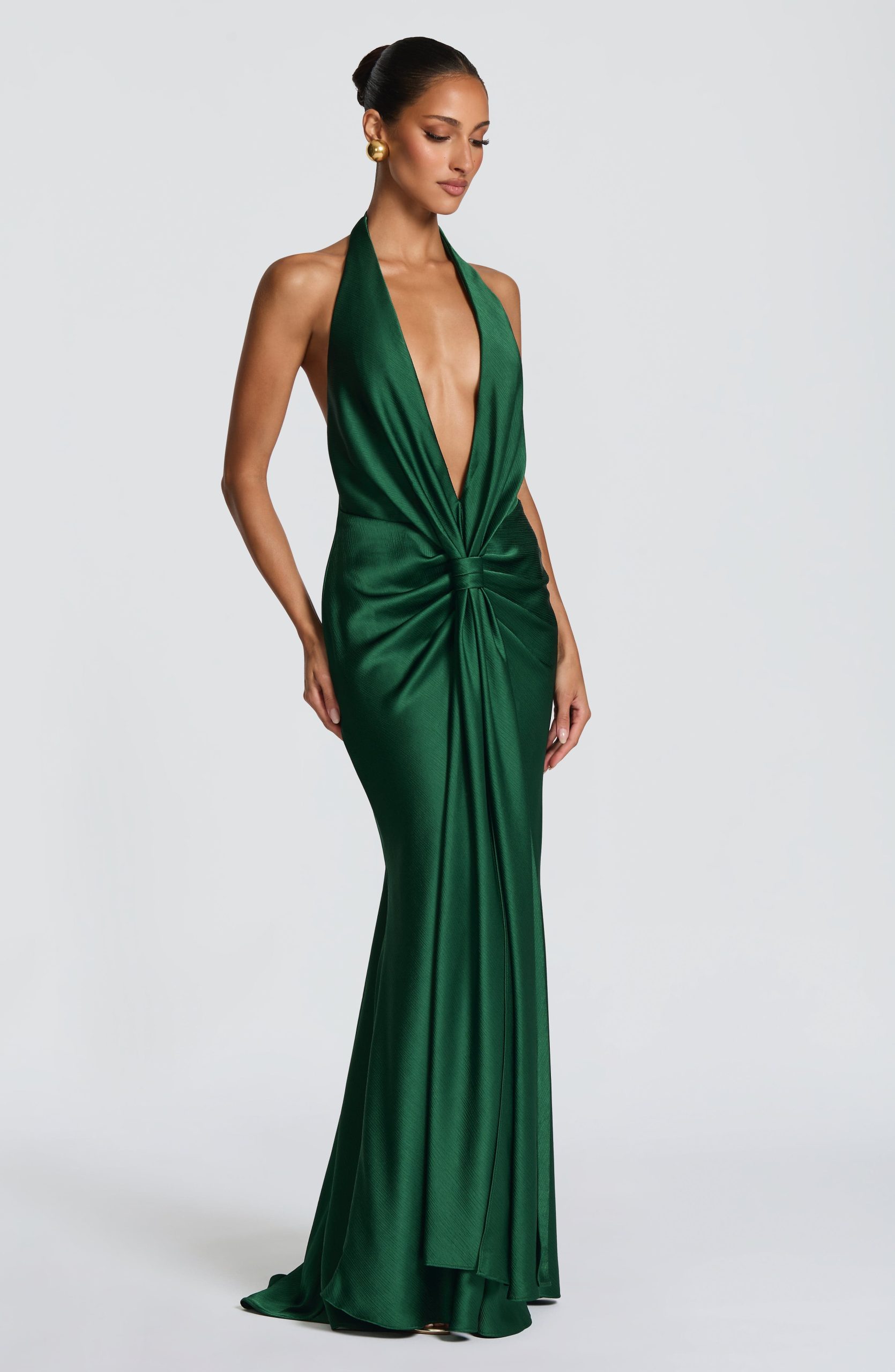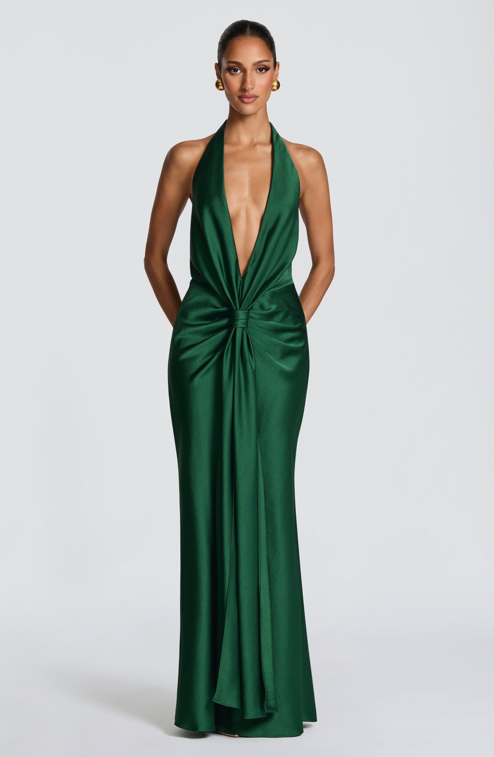 The Linette Gown in emerald is crafted from textured satin. A deep plunging neckline with halter straps frames the silhouette, while strategic pleating across the hips adds dimension. A signature knot detail at the centre front flows into an drape panel, and the gently flared skirt concludes with a subtle train.
