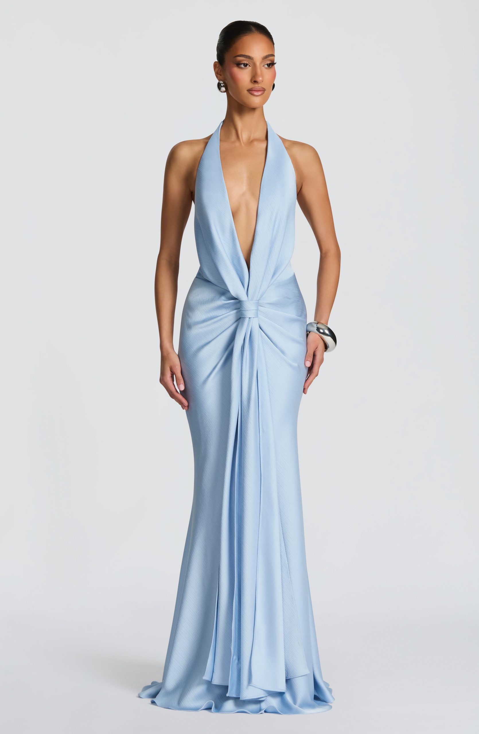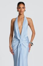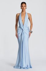 Linette Gown in Glacier Blue, a floor-length satin masterpiece featuring a plunging halterneck neckline, hip pleating, and a striking knotted drape panel. The gently flared skirt flows into an understated train for timeless elegance.