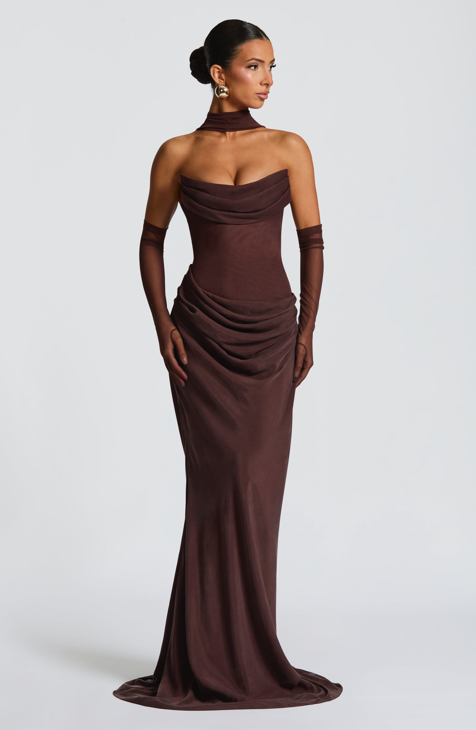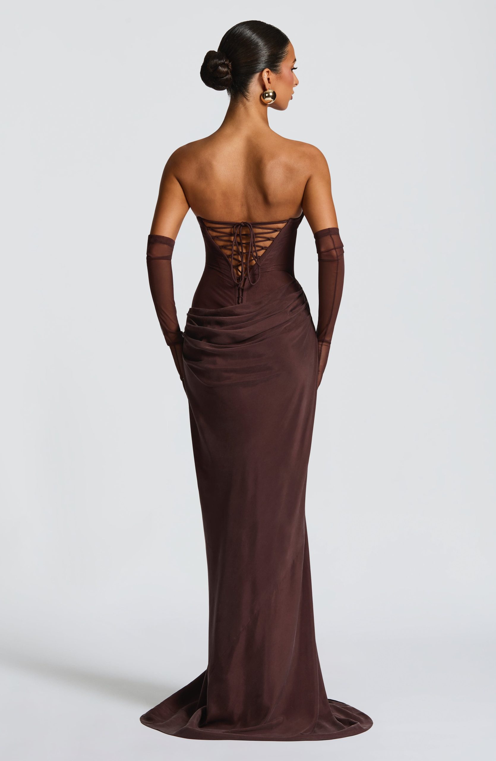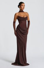The Plum Brown Liora Maxi Dress features a strapless cowled neckline, structured bust, and lace-up back with boning for a tailored fit. Its asymmetric bias-cut skirt offers a graceful fit-and-flare silhouette, finished with a discreet side zipper.