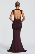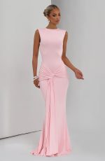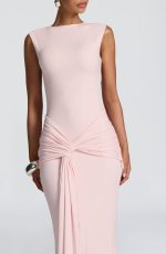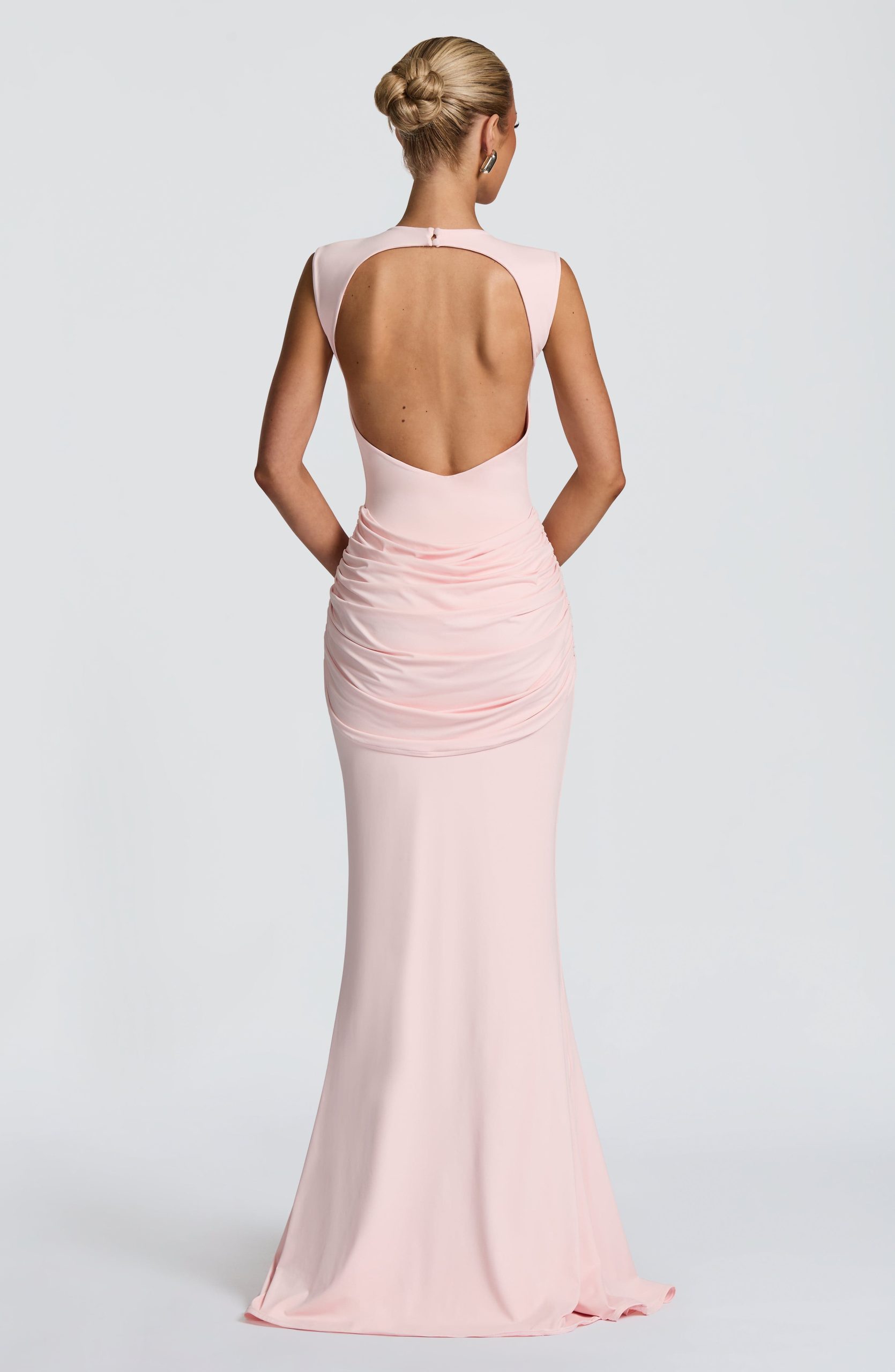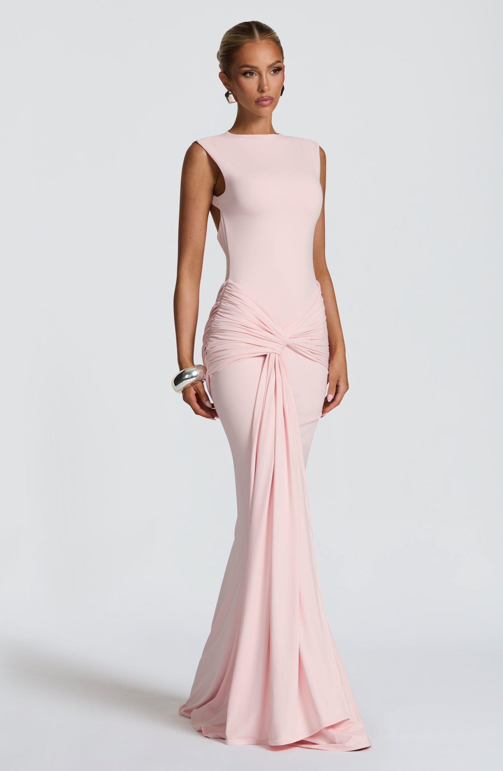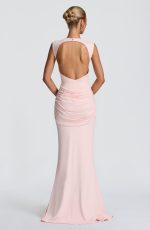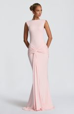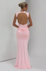 The Lorenza Maxi Dress in blush combines a sleek high neckline with an open keyhole back. Made from slinky jersey, it features a fitted bodice and fit-and-flare skirt, highlighted by a ruched knot detail and drape tie for a refined silhouette.