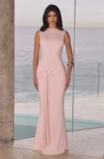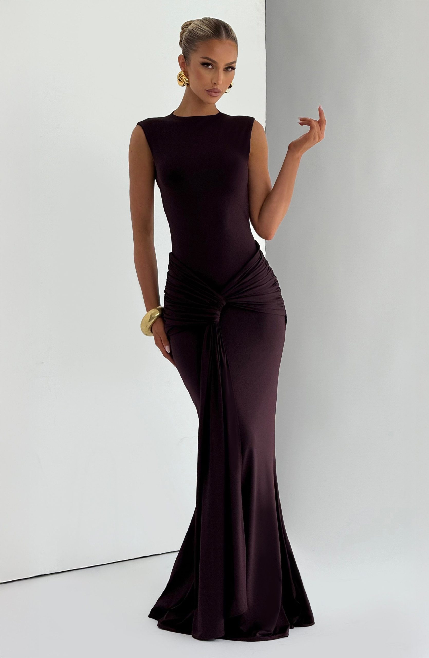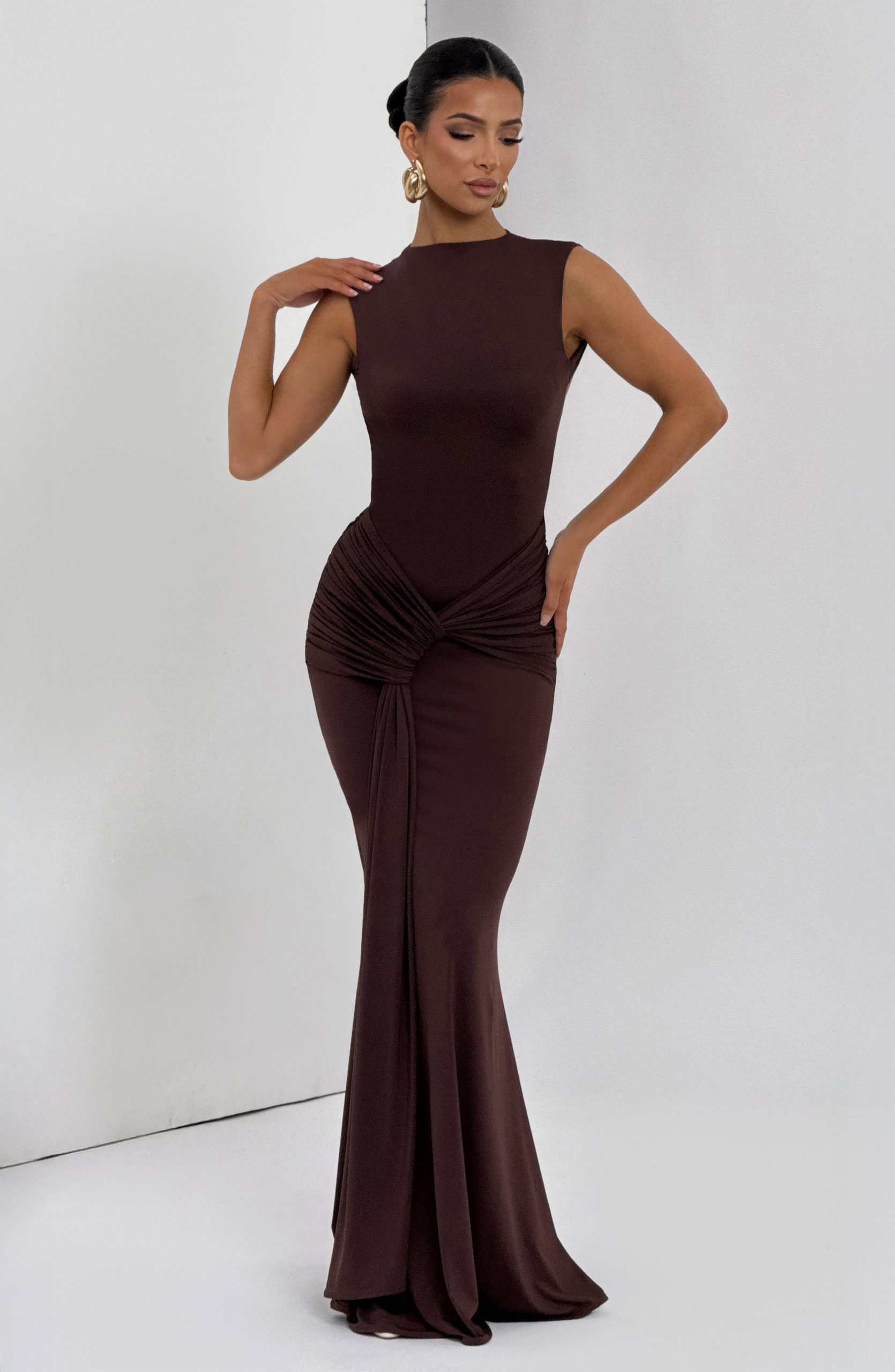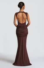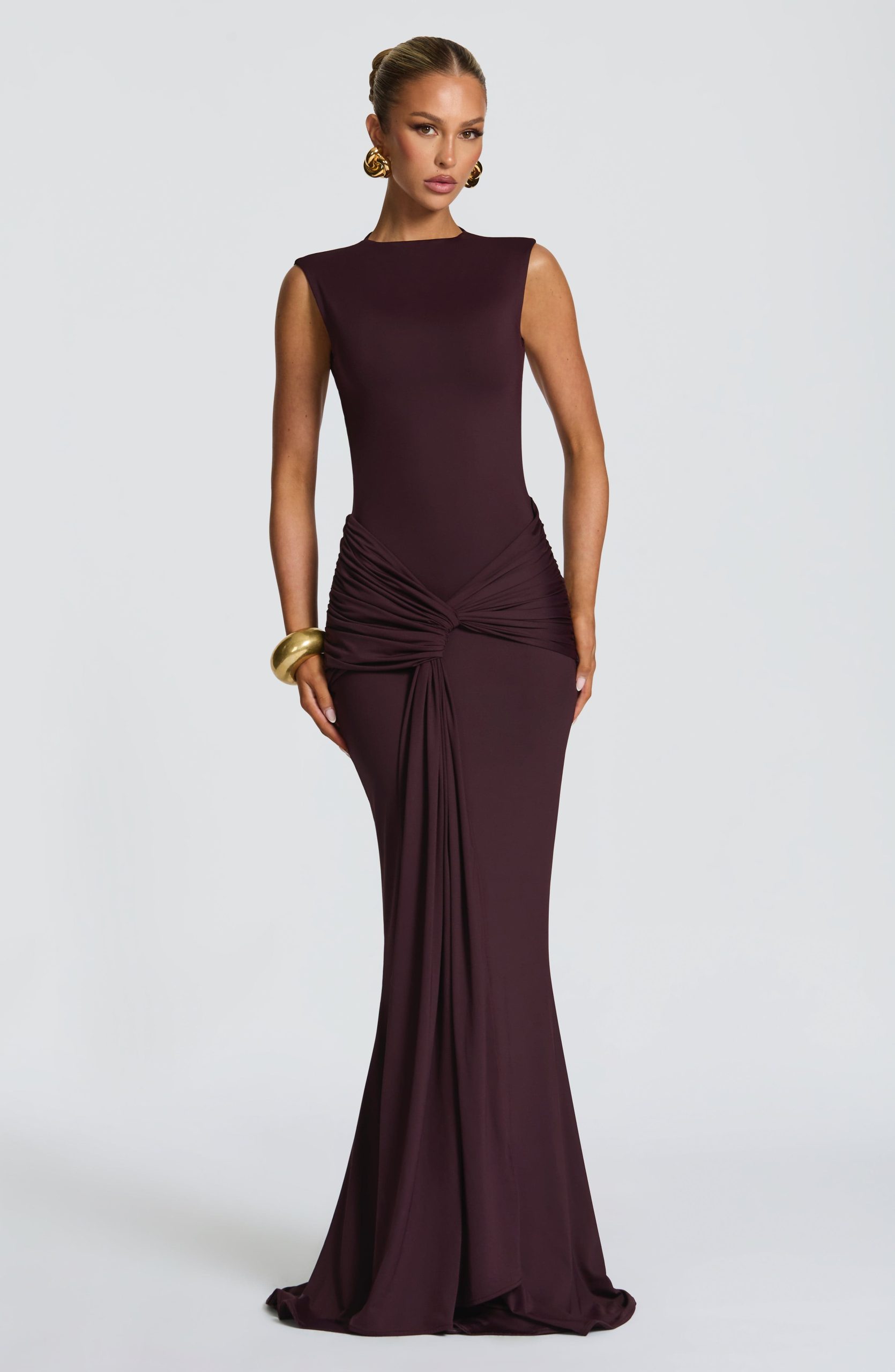The Lorenza Maxi Dress in blush combines a sleek high neckline with an open keyhole back. Made from slinky jersey, it features a fitted bodice and fit-and-flare skirt, highlighted by a ruched knot detail and drape tie for a refined silhouette.