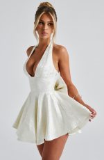 Made from our luxe jacquard floral fabric with a pretty sheen, Madeline exudes romance. This playsuit design has built in shorts with a skirt overlay, plunge halter neckline and bow to the back which is detachable. The look is complete with a full, circle shaped skirt which is slightly raised at the sides for playful drama. Dress yours up with sleek waves, a mini clutch and platform heels.