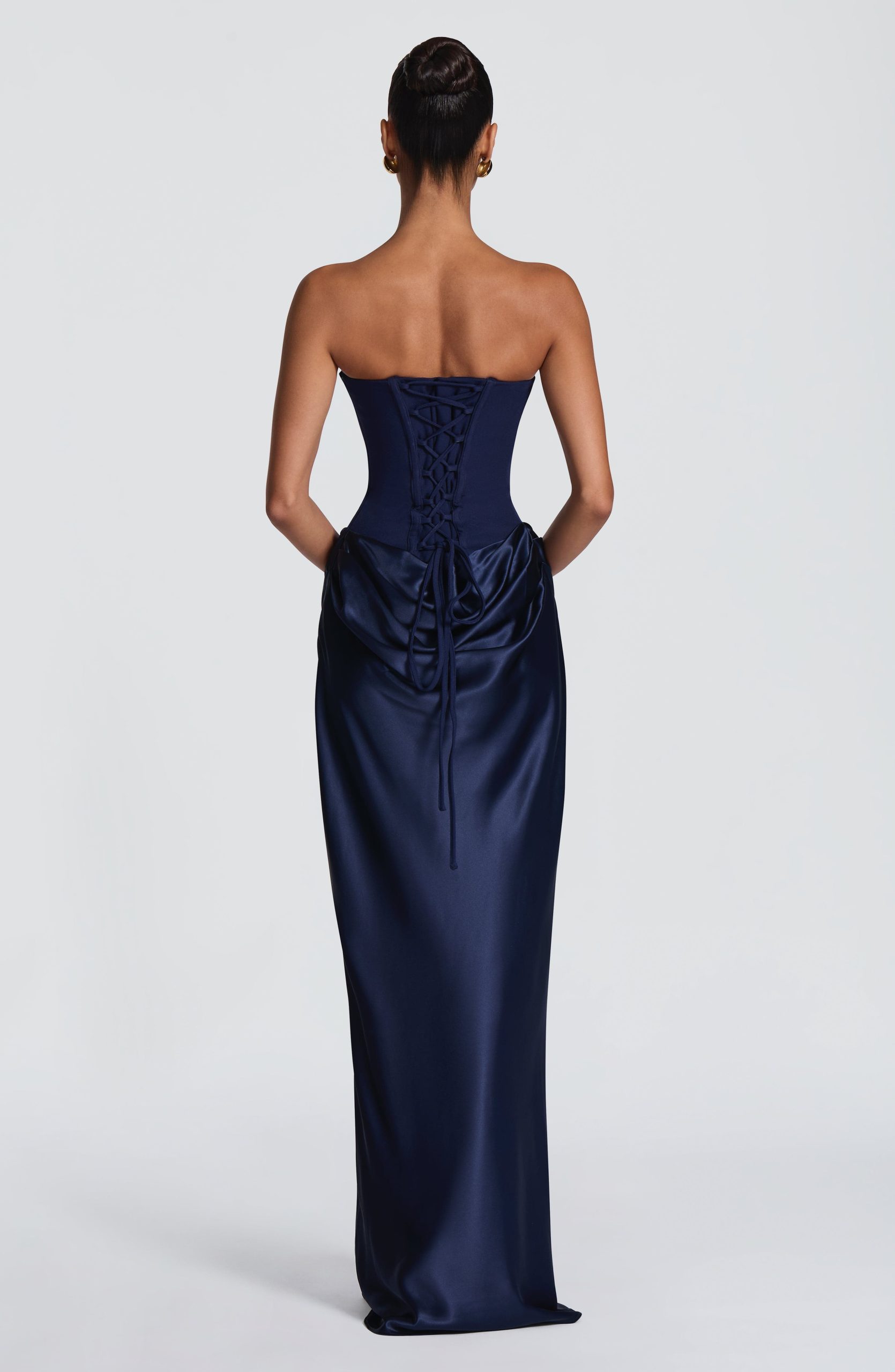Maggie Maxi Dress in navy features a structured strapless crepe bodice with internal boning and scooped neckline. Dropped waist transitions to a contrast satin cowl overlay skirt with deep pleats. Lace-up back allows for a cinched, customizable fit. Elegant and refined for special occasions.