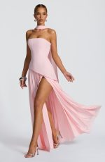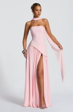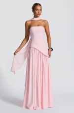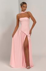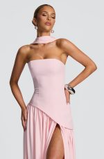 The Maliyah Maxi Dress in blush features a fitted crepe bodice with an asymmetrical hem and lace-up back, paired with a flowing chiffon skirt. Its full, gathered design includes a thigh-high split, creating an elegant and sophisticated silhouette.