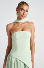 Ethereal elegance meets modern edge in the Maliyah Maxi Dress in Mint. This stunning strapless gown features a structured, non-stretch crepe bodice with an asymmetrical hem and a delicate lace-up back for the perfect fit. The contrast chiffon skirt cascades in full, gathered layers, flowing effortlessly with every step, while a thigh-high split adds a bold touch. Complete the look with the matching chiffon scarf. A dreamy statement piece for any occasion.