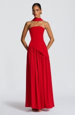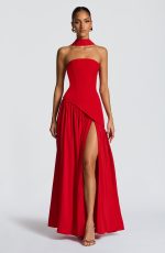 The Maliyah Maxi Dress in red features a fitted crepe bodice with an elegant asymmetrical hem and a delicate lace-up back. Its flowing chiffon skirt is gathered for fullness and includes a striking thigh-high split, complemented by a matching scarf for a refined, sophisticated look.
