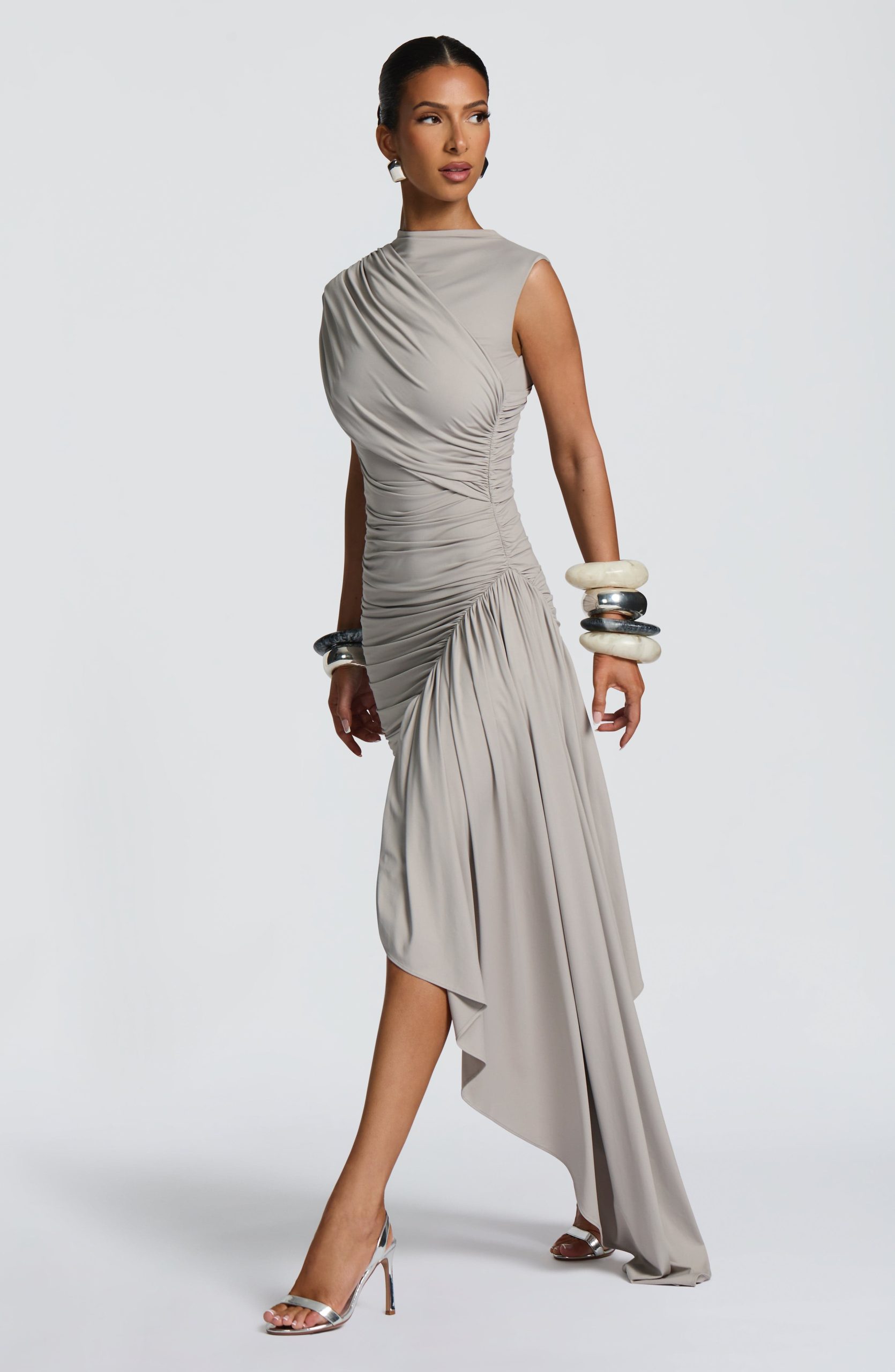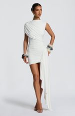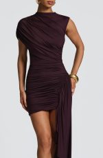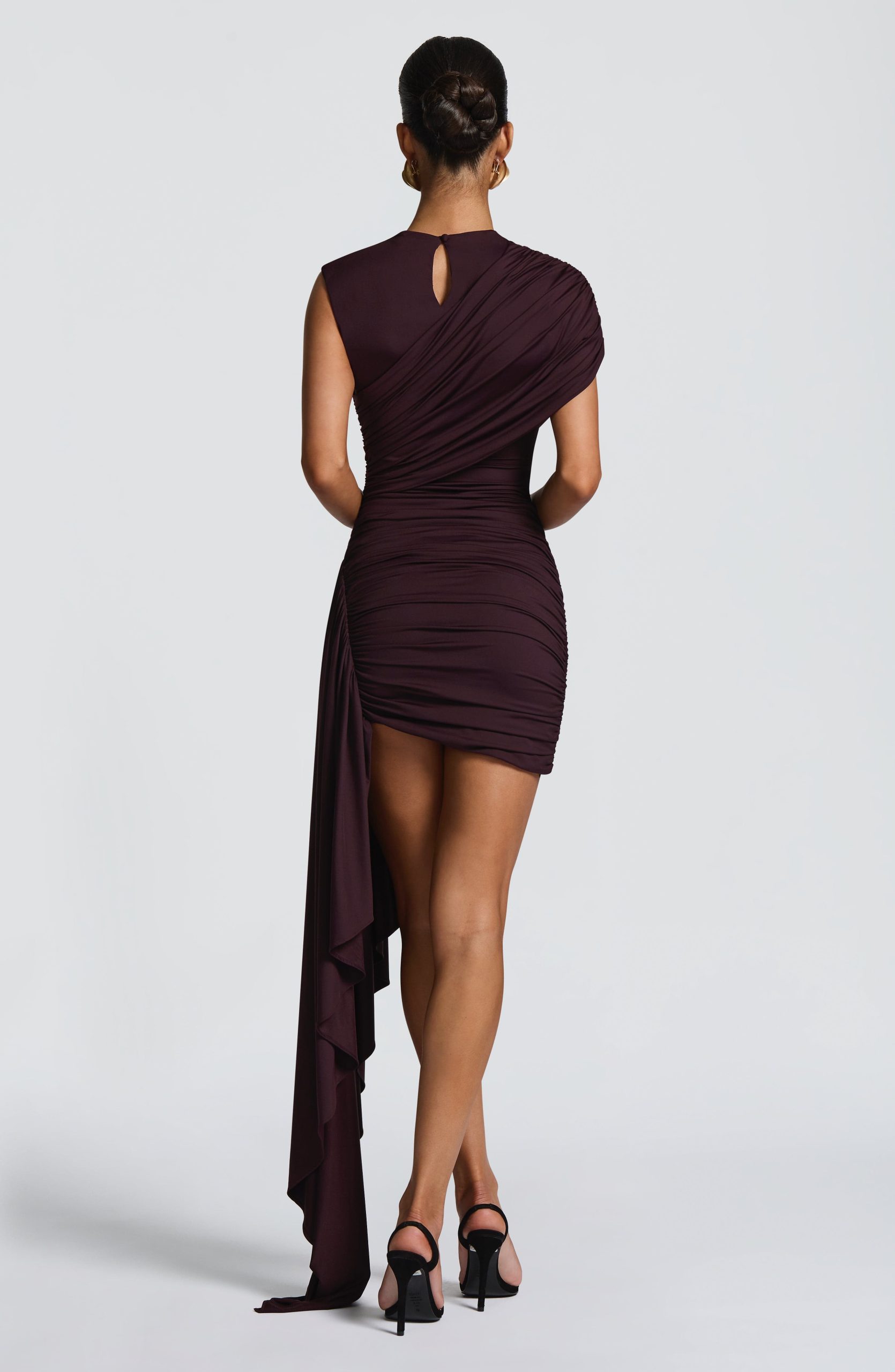 The Marnie Mini Dress in Rose Brown is crafted from slinky jersey and fully lined, it features a high neckline, directional pleats, and strategic ruching through the bodice. A shaped gathered drape panel and cowled back overlay create dimension, while the button and elastic loop closure with keyhole detail adds understated elegance.