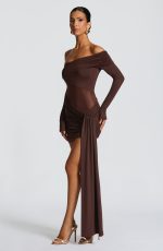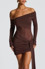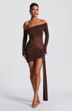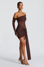 The Mavra Mini Dress in plum brown features a stretch slinky fabric with an asymmetric sheer mesh panel and bardot neckline. Long sleeves with flared cuffs complement the ruched overlay on the neckline and the asymmetric ruched skirt with a left hip panel. This mini dress offers a refined, elegant silhouette perfect for sophisticated occasions.